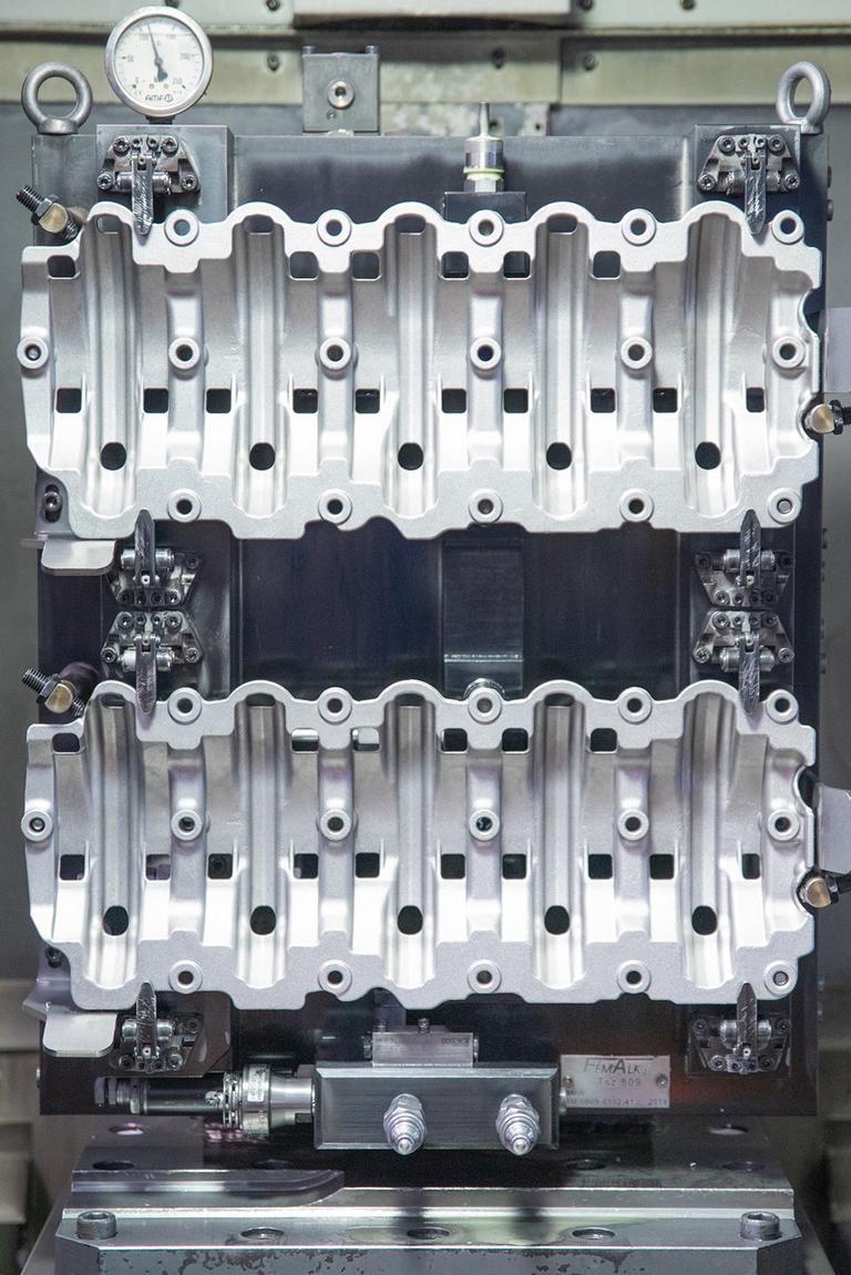Beladen werden die Vorrichtungen außerhalb der Maschine. Hierzu wird ein Druckspeicher verwendet. So kann Hauptzeitparallel außerhalb des Maschinenraums die nächste Bearbeitung ideal vorbereitet werden. Die Bauteile werden dann in gespanntem Zustand in die Maschine übergeben. Nur so gelingt es, die Rüstzeiten so niedrig zu halten, dass die Teile, die die 42 Druckgießmaschinen überwiegend vollautomatisch gießen, auch ohne große Zeitverzögerung weiterbearbeitet werden können. Die Serienproduktion muss dabei mit Stückzahlen zwischen zehn und 15.000 Stück pro Woche sowohl kleine als auch große Serien bewältigen. „Insbesondere in der Anlaufphase eines neuen Produkts erfordert die Kleinserienproduktion einen schnellen Wechsel der Vorrichtungen, um die Maschinenauslastung auf einem hohen Niveau zu halten“, erklärt uns Gábor Soós.