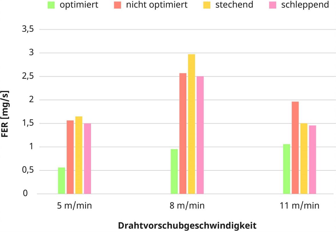 Grundsätzlich kann festgestellt werden, dass die Schweißrauchemission bei 5 m/min Drahtvorschub und neutraler Brenneranstellung am geringsten ist, wobei auffällt, dass bei einer Drahtvorschubgeschwindigkeit von 11 m/min weniger Ausstoß entsteht als bei 8 m/min. Bei schleppender Brennerführung fallen die Emissionen bei allen Drahtvorschubgeschwindigkeiten eine Spur niedriger aus als bei stechender.