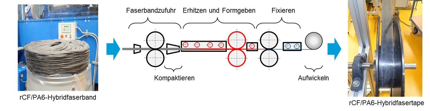 Hierbei werden die Carbonfasern in einem ersten Schritt geöffnet und mit thermoplastischen Matrixfasern (Polyamid 6) gemischt. Im Anschluss wird die Fasermischung in einem für die Verarbeitung von Carbonfasern modifizierten Krempelprozess weiter separiert und orientiert. Am Auslauf der Krempel wird das im Krempelprozess entstehende Faserflor zu einem Faserband zusammengefasst und in eine Kanne abgelegt. Dieses rCF/PA6-Faserband stellt das Ausgangsmaterial für den folgenden Tapebildungs-Prozess dar und weist bereits eine Vororientierung der Carbonfasern auf. Im nachfolgenden Verstreckprozess kann die Orientierung der Fasern noch gesteigert werden. Durch das Verziehen des Faserbandes werden die Fasern in Verzugsrichtung bewegt und längs ausgerichtet. Der letzte Prozessschritt ist die Tapebildung, bei der das Faserband unter Spannung in die gewünschte Form gebracht und anschließend in eine endlose Tapestruktur fixiert wird. Bei der Fixierung schmelzen die Thermoplastfasern teilweise oder komplett auf und erstarren anschließend.
