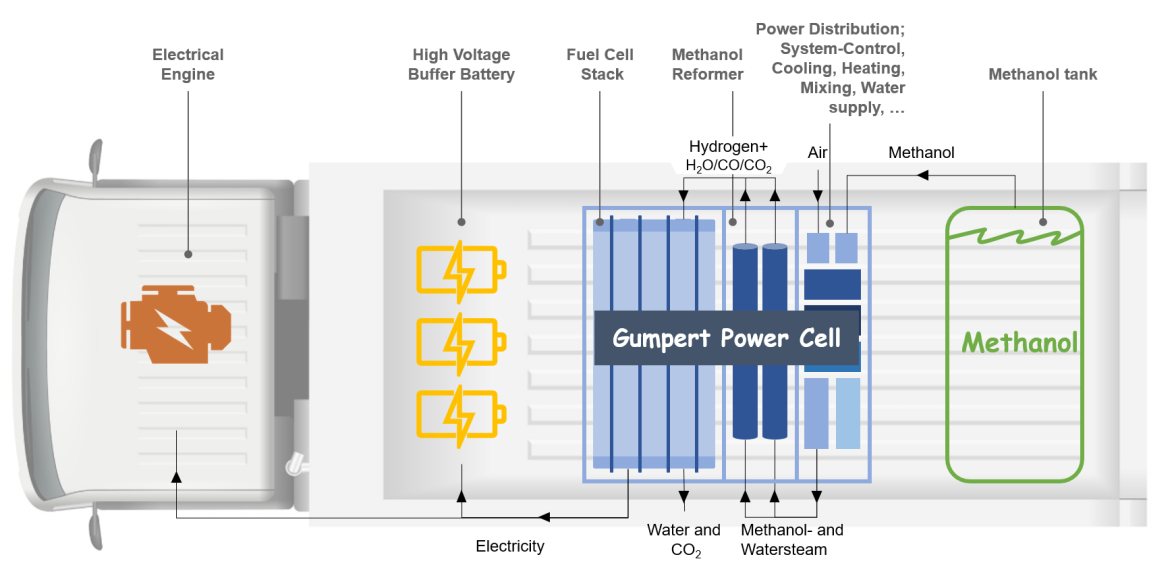 In einer Methanol-Brennstoffzelle à la Gumpert werden Methanol und Wasser im Verhältnis 60:40 gemischt und in einen Verdampfer geführt. Dampfförmig wird das Gemisch dann in einem Reformer weitergeleitet, wo Wasserstoff sowie CO2 und Wasserdampf entstehen. Das Reformiergas wird dann einer Brennstoffzelle zugeführt, wo der Strom erzeugt wird, der den elektrischen Antriebsstrang mit Energie versorgt.