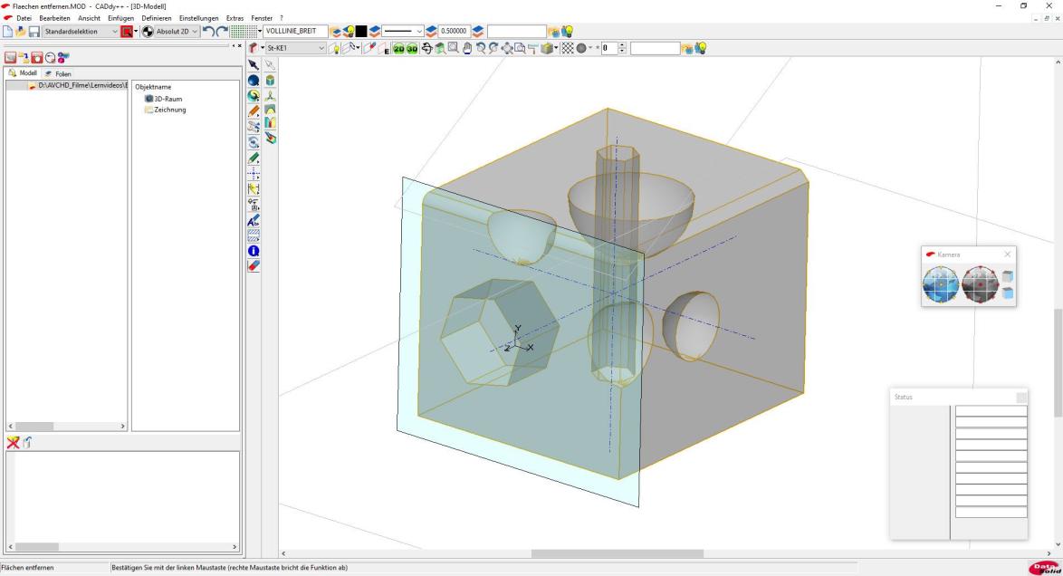 Ist dies der Fall, so wird mittels eines Linksklicks die Fläche beziehungsweise die ausgewählte Bohrung schlussendlich entfernt. Ein Rechtsklick führt hingegen dazu, dass die Funktion ohne eine Veränderung am Volumenkörper abgebrochen wird.