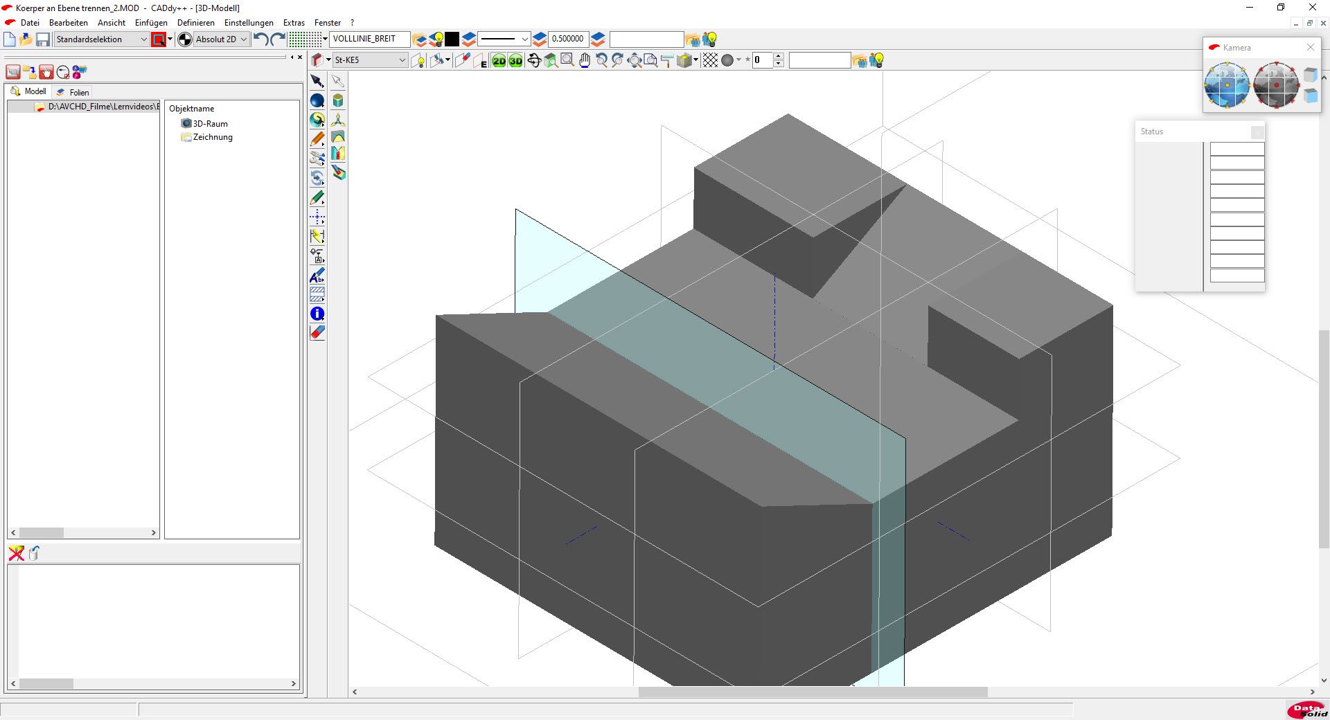 Dies ist deshalb möglich, weil diese Funktion die Körperfläche entlang der Linie teilt, wenn die Linie über die jeweiligen Körperkanten hinausragen. Ist die Linie kleiner, wird lediglich eine Kante auf der Fläche erzeugt. Diese lassen sich jedoch über die Funktionen „Schiebekörper Z“ beziehungsweise „Offset Fläche“ extrudieren, sofern eine geschlossene Fläche vorliegt.