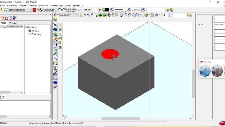 Beim Konstruieren kommt es immer wieder vor, dass Änderungen nötig sind. Obwohl BeckerCAD nicht über den Funktionsumfang von CADdy++ verfügt, sind dennoch viele Funktionen vorhanden, die es erlauben, falsche Fasen zu entfernen, 3D-Körper größer beziehungsweise kleiner zu ziehen oder dort eingebrachte Bohrungen wieder verschwinden zu lassen.