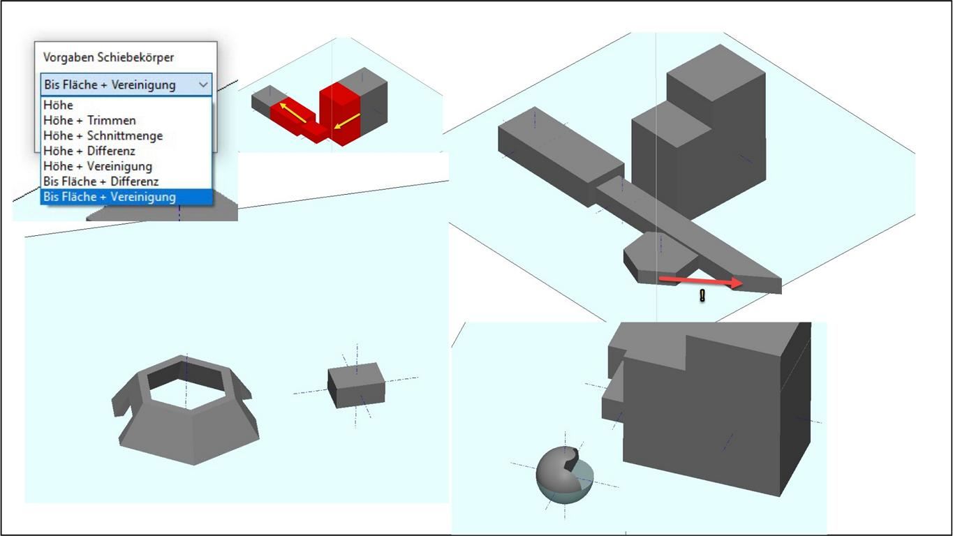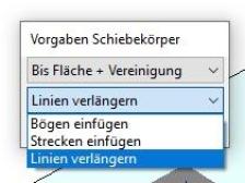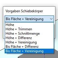 Ist diese Option aktiviert, wird der neue Schiebekörper nicht einfach als zusätzliches Objekt erstellt. Stattdessen berechnet das Programm die Schnittmenge mit einem bereits existierenden Körper. Das bedeutet: Nur der Bereich, in dem sich der neue Schiebekörper und der Zielkörper überlappen, bleibt als neues Volumenmodell erhalten.