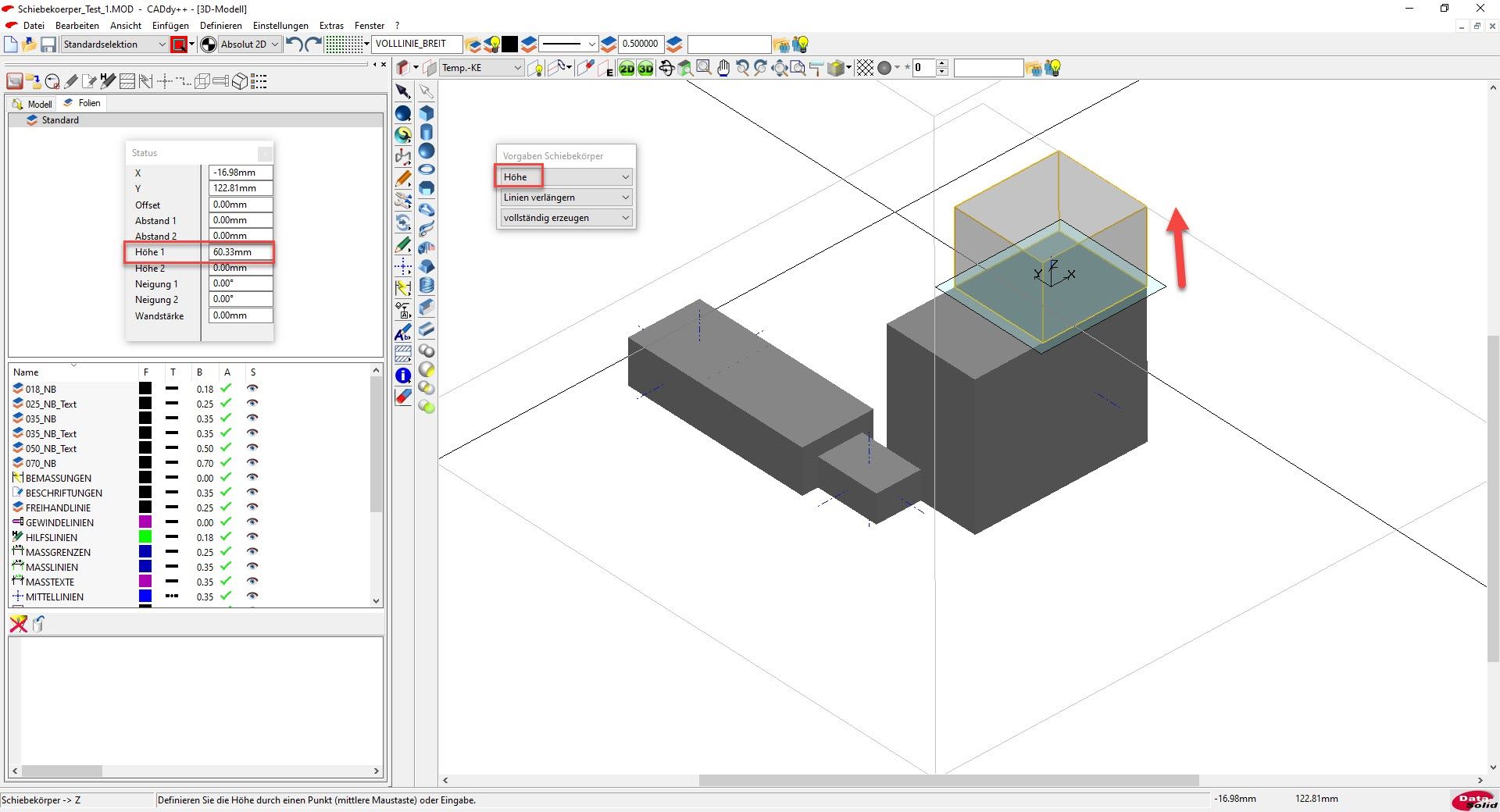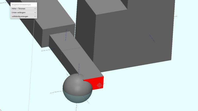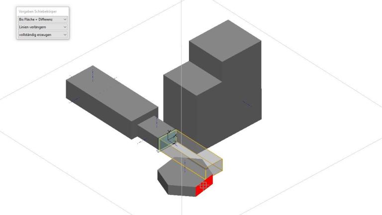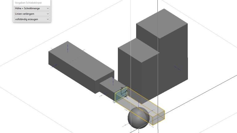 In der Grundeinstellung beziehungsweise beim Start von BeckerCAD 3D Pro ist die Schiebekörperfunktion mit den Vorgaben „Höhe“, „Linien verlängern“ und „vollständig erzeugen“ aktiv.