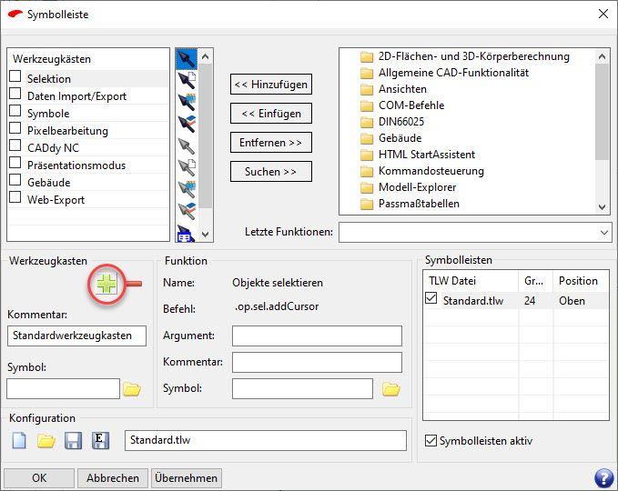 Auf diese Weise können nach und nach diejenigen Symbole zusammengesucht werden, die man im direkten Zugriff haben möchte. Nach Klick auf Ok werden diese Symbole in die eigene Symbolleiste übernommen. Wurde versehentlich ein falsches Symbol in den eigenen Werkzeugkasten gelegt, so kann dieses über den Button „Entfernen“ wieder aus dem eigenen Werkzeugkasten entfernt werden.