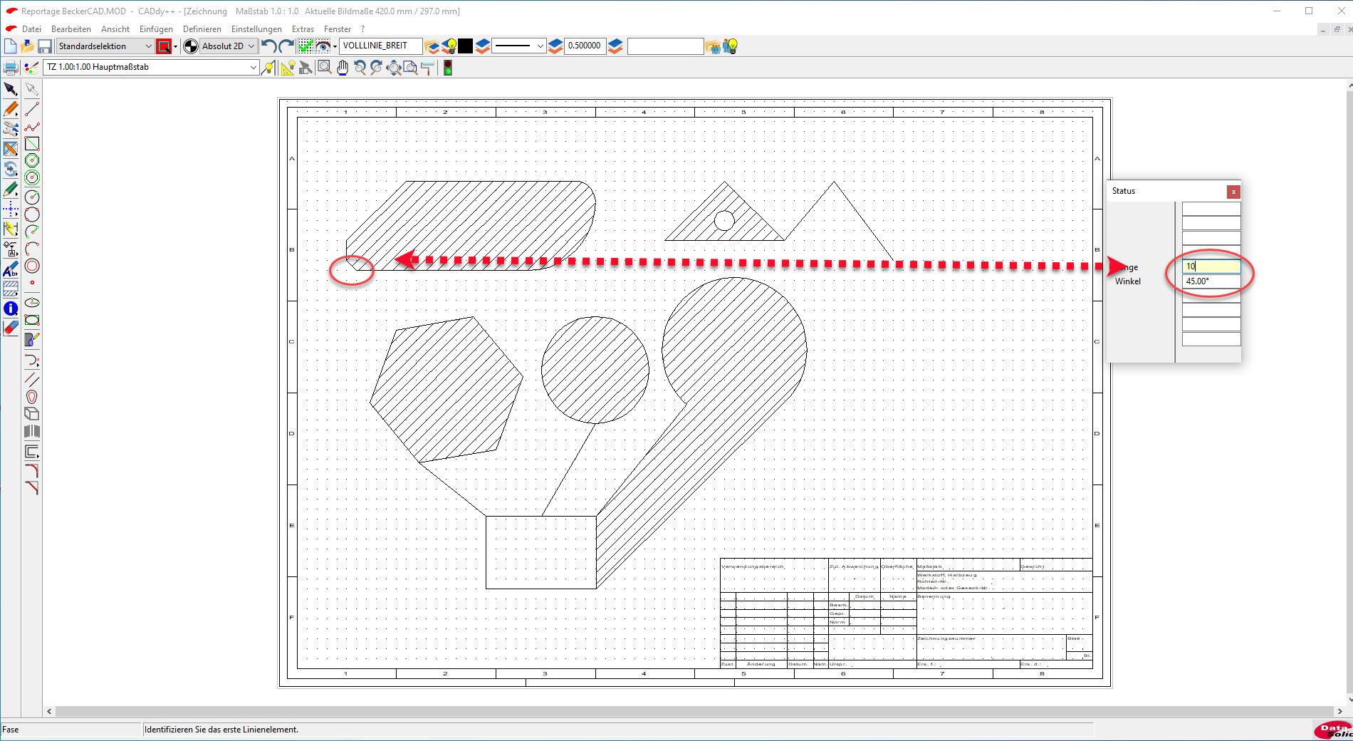 Beim Abrunden oder Fasen ist zu beachten, dass BeckerCAD in der Voreinstellung ein freies Einstellen des Radius beziehungsweise der Fase per gedrückter linker Maustaste zulässt. Möchte man hingegen einen genau definierten Radius oder eine Fase mit einem bestimmten Winkel einzeichnen, so muss nach Aufruf der entsprechenden Funktionen über die Leertaste – oder per Mausklick auf das entsprechende Eingabefeld – in das Status-Feld gesprungen werden, wo passende Werte einzutragen sind. Eingaben dabei unbedingt mit der Return-Taste abschließen!