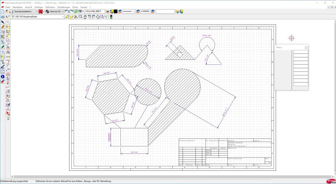 In BeckerCAD gibt es dazu entsprechende Funktionen, die eine normgerechte Bemaßung sicherstellen. Das Programm ist sogar in der Lage, nachträglich Änderungen an Maßen einzufügen. So ist es beispielsweise möglich, Maße als sogenannte Prüfmaße kenntlich zu machen oder an Maßen Toleranzen hinzuzufügen. Selbstverständlich werden auch Halbmesser und Fasenmaße korrekt eingetragen.