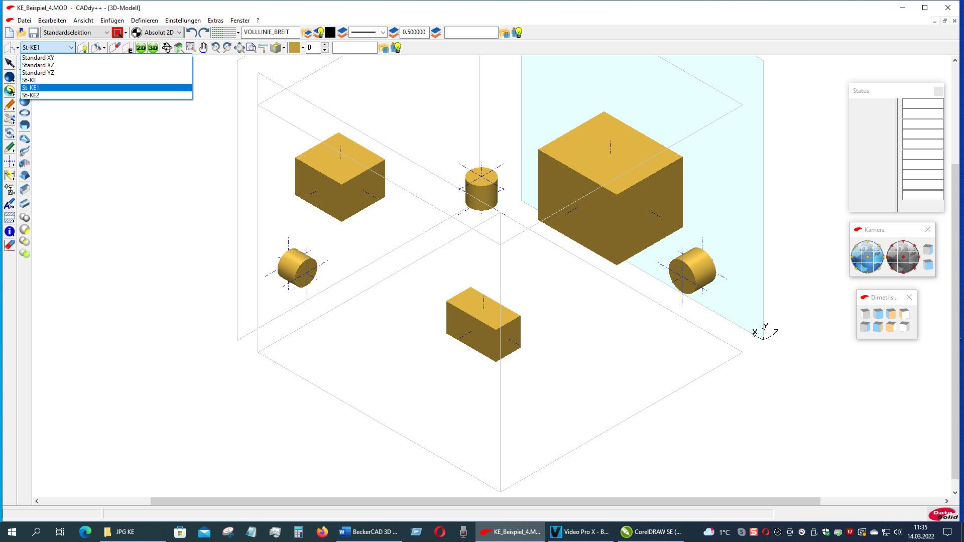 Auf dieser Konstruktionsebene kann jeweils wie gewohnt gezeichnet werden. Zu beachten sind jedoch die Lageorientierung sowie die Lage des Nullpunkts, der sich im Schnittpunkt der jeweils sich schneidenden Achsen XYZ befindet. Die positive Richtung der jeweiligen Achsen wird von BeckerCAD durch Pfeile angedeutet.