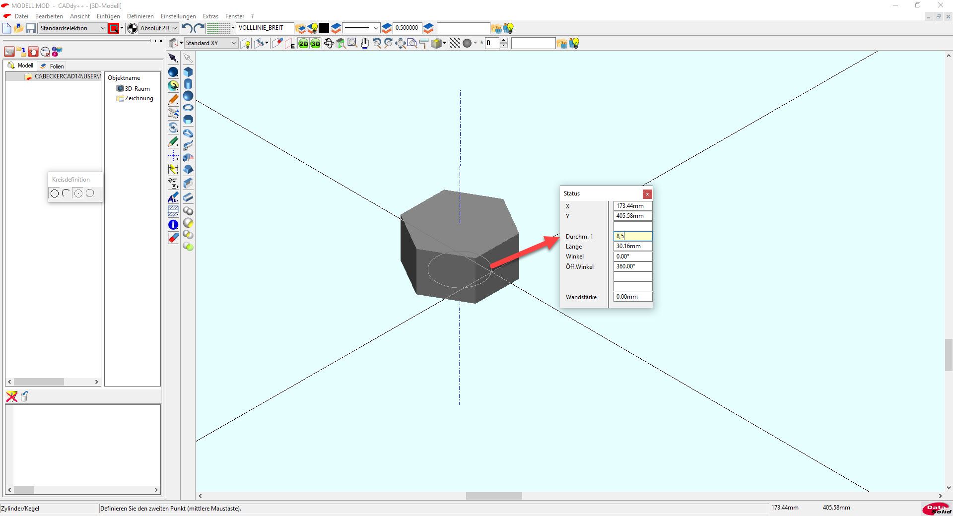 Mit einer Mischung aus Werteeingabe und interaktivem Tun können sehr einfach unterschiedlich große Zylinderkopfschrauben gezeichnet werden, die danach in BeckerCAD eingelesen werden können, wo auch die Nachbearbeitung des Schraubenkopfes erfolgen kann, um beispielsweise einen Schlitz oder einen Sechskant einzuarbeiten.