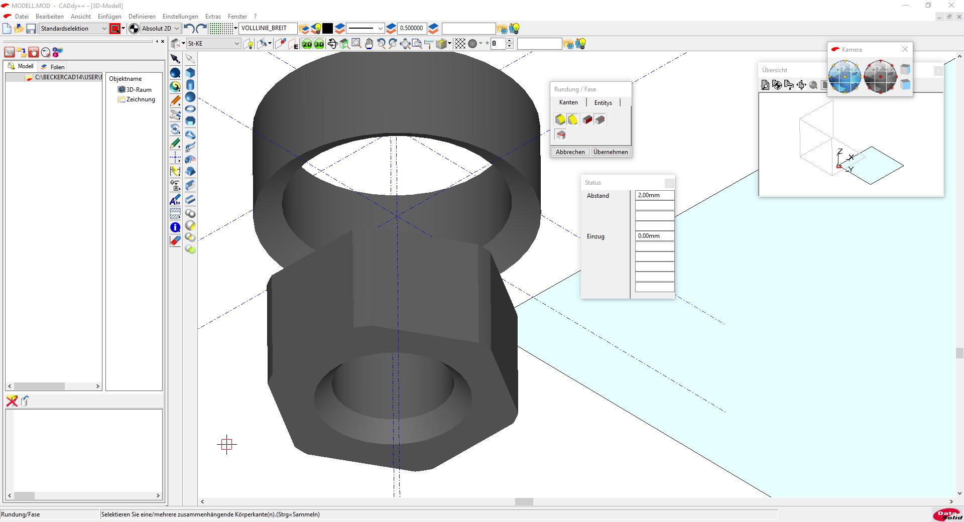 Über die Funktion „Rundung/Fase“ werden die beiden Bohrungskanten mit einer Senkung versehen, die jeweils ein wenig größer sein müssen, als der Gewindeaußendurchmesser beträgt. Da es sich hier um ein Gewinde M10 handelt, ist ein Senkdurchmesser von 11 Millimeter passend. Da der Kernlochdurchmesser 8,5 Millimeter beträgt, muss als Abstandsmaß im Statusfeld der Wert 1,25 eingetragen werden.