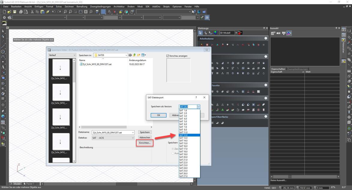 Dabei ist zu beachten, dass es in TurboCAD keine Export-Funktion im herkömmlichen Sinn gibt. Vielmehr sind die Exportformate über das Menü „Datei/Speichern unter…“ zugänglich. Wird das SAT-Format ausgewählt, dann ist der Button „Einrichten…“ zu betätigen, woraufhin ein Fenster erscheint, aus dem die SAT-Version 12 gewählt werden kann.