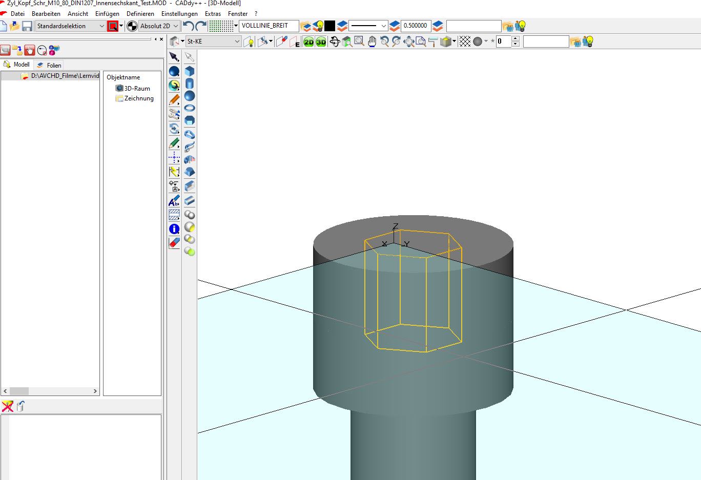 Nachdem die rohe Schraube in BeckerCAD eingelesen ist, muss noch der Schraubenkopf nachgearbeitet werden, damit beispielsweise eine Zylinderschraube mit Schlitz- oder eine Zylinderschraube mit Innensechskant entsteht.