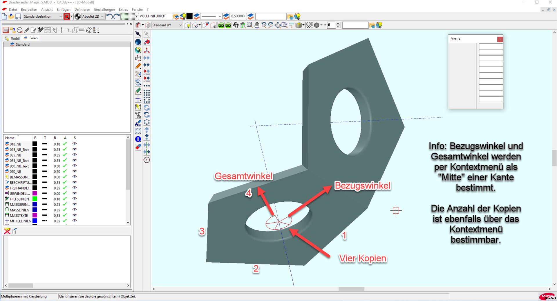 Der Bezugswinkel wird über die Funktion „Mitte“ des Kontextmenüs bestimmt. In gleicher Weise wird mit dem Gesamtwinkel verfahren. Hier wird mit „Mitte“ und Klick auf die gewünschte Körperkante die Endposition des Winkels für die letzte Kopie bestimmt. Die Anzahl der Kopien wird in das Statusfeld eingetragen.