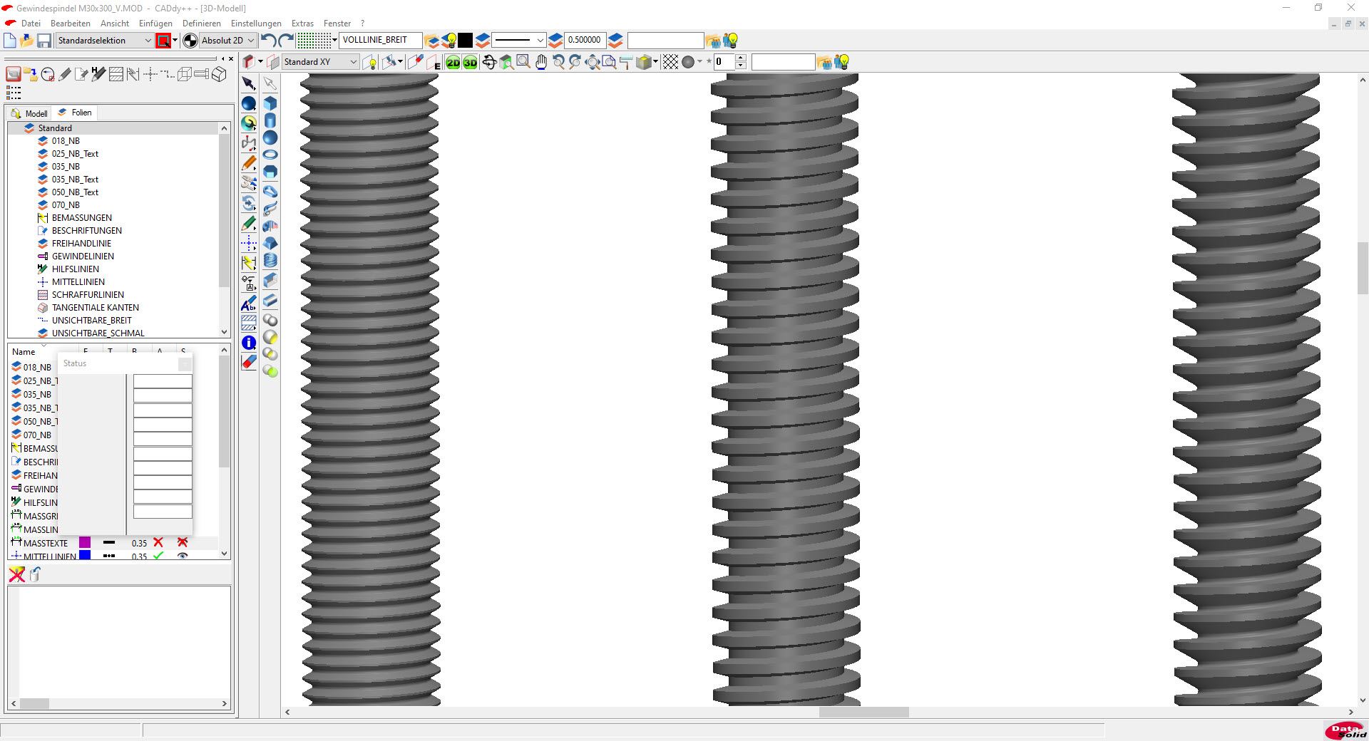 Während eine Druck- oder Zugfeder mit der in BeckerCAD neu vorhandenen Funktion relativ einfach erzeugbar ist, müssen für eine Gewindestange im Vorfeld einige geometrisch wichtige Werte aus Tabellenbüchern oder entsprechenden Normblättern entnommen werden, ehe an eine normgerechte Umsetzung dieser Aufgabe gedacht werden kann.