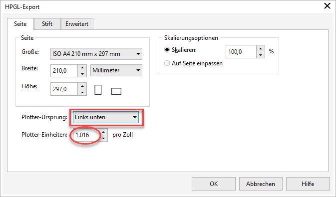 Beim Export in eine Plotterdatei ist unbedingt darauf zu achten, dass die Exportparameter korrekt eingestellt sind. Insbesondere muss sich der Plotter-Ursprung links unten befinden. Die Standardeinstellung ist hier die Seitenmitte, weshalb eine Anpassung nötig ist, soll das Teil korrekt graviert werden. Zudem muss im Feld Plottereinheiten der Wert 1.016 pro Zoll stehen, was jedoch bereits der Standardwert ist. In diesem Eingabefeld ist demnach üblicherweise keine Anpassung nötig.