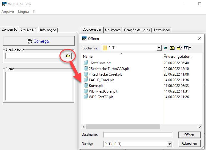 Se um arquivo de plotadora do Corel Draw estiver disponível, ele poderá ser selecionado em uma caixa de diálogo do Windows usando o botão "Abrir".