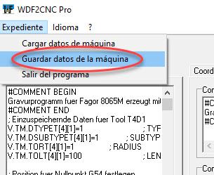 Después de haber realizado todas las entradas, los datos de la máquina deben guardarse para que estén disponibles de nuevo en cualquier momento. Esto se hace a través de "Expediente/Guardar datos de máquina". La ventana de entrada que aparece se puede usar para especificar el nombre del archivo de la máquina y dónde se guardará.