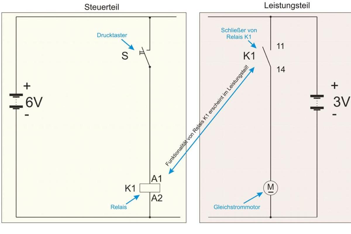 Ein Relais besitzt eine Spule, in deren Mitte ein Weicheisenkern eingelassen ist. Wird die Spule nun von Strom durchflossen, wird vom sich aufbauenden Magnetfeld ein Kontaktblech, der sogenannte Anker, angezogen. An diesem Kontaktblech sind weitere Kontaktbleche befestigt, die zwangsweise mitbewegt werden und dabei Kontakte öffnen beziehungsweise schließen. Auf diese Weise werden Strompfade im Leistungsteil geöffnet (Öffner) beziehungsweise geschlossen (Schließer).