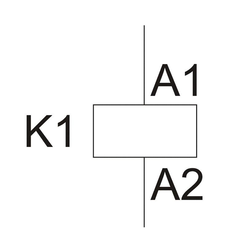 Das Schaltzeichen für ein Relais ist ein simples Rechteck, dem links mit fortlaufender Nummer die Relaiskennziffer hinzugefügt wird, recht davon werden oben beziehungsweise unten die Bezeichnungen der Eingänge für den Erregerstrom eingetragen.