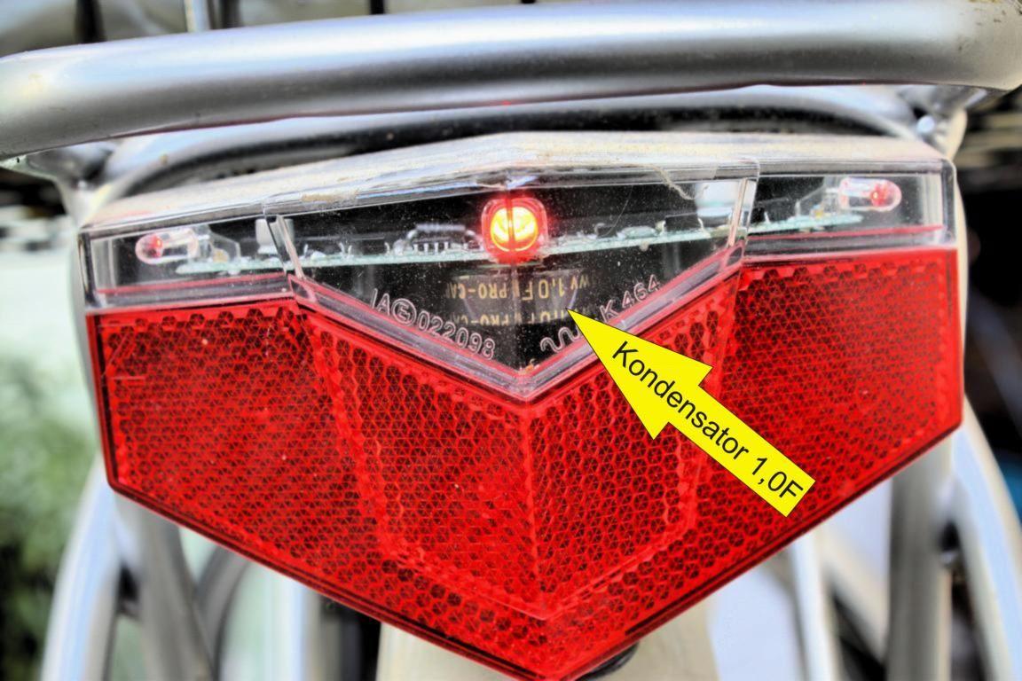 Die Stromspeicherfähigkeit von Kondensatoren nutzen Fahrradhersteller, um damit für einige Minuten den Betrieb der Fahrradbeleuchtung aufrechtzuerhalten. Ein genauer Blick auf die Elektronik zeigt, dass für diesen Zweck ein verhältnismäßig großer Kondensator mit einer Kapazität von 1 Farad verwendet wird.