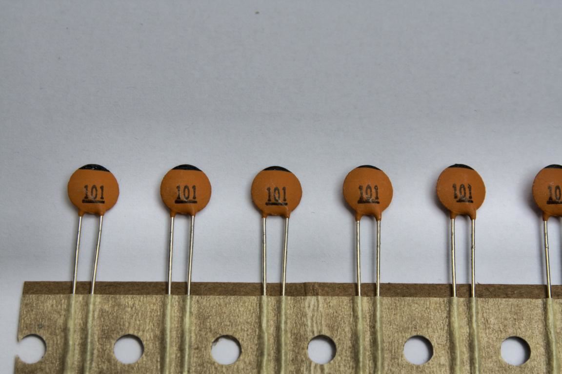 Nachfolgendes Bild zeigt Kondensatoren mit dem Aufdruck 101. Diese Kondensatoren haben demnach eine Kapazität von 100 pF, da die ersten beiden Zahlen (10) den Kapazitätsbasiswert ergeben, dem noch eine Null (1) angehängt wird. Das Ergebnis der Berechnung ist die Kapazität des Kondensators.