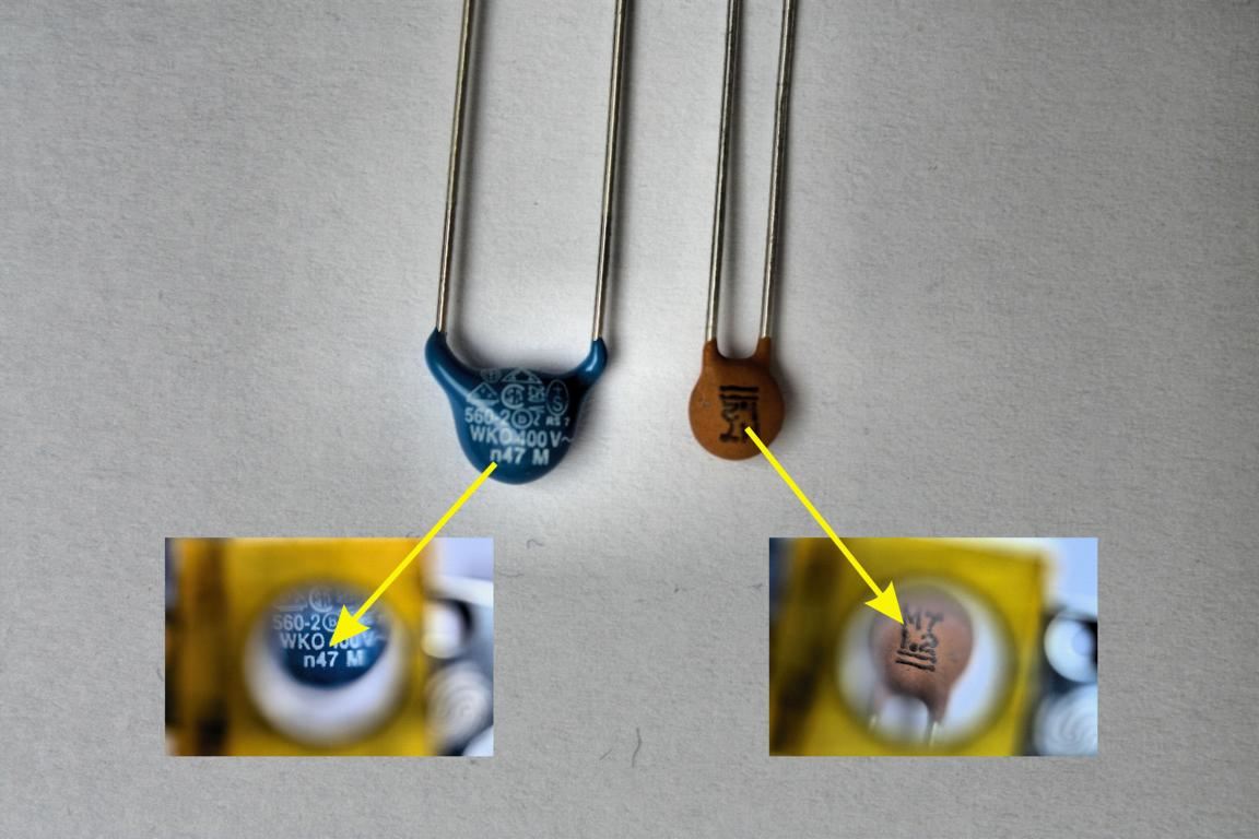 Allerdings sind die oft sehr klein aufgedruckten Kapazitätsangaben mit dem freien Auge teils gar nicht mehr zu lesen. Aus diesem Grund lohnt sich die Anschaffung einer stark vergrößernden Lupe. Nachfolgendes Bild zeigt zwei Kondensatoren, deren Kapazität ohne Lupe nur schwer lesbar ist.