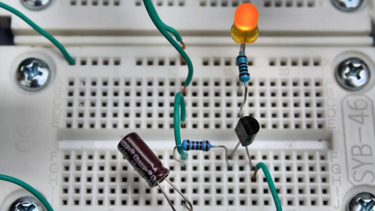 Die Geschwindigkeit, mit der die LED erlischt, kann auch durch einen größeren Widerstand verlängert werden. Wird der 22 kOhm-Widerstand gegen einen 47 kOhm-Widerstand getauscht, so ist eine deutlich längere Brenndauer der LED feststellbar, die dann allerdings nicht mehr ganz so hell leuchtet.
