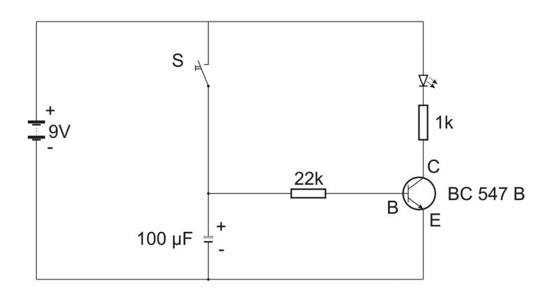 Wie erwähnt, eignet sich der Kondensator dazu, eine Abfallverzögerung zu verwirklichen. Dadurch kann ein Stromausfall überbrückt oder eine gezielte Wirkung, etwa das langsame Verlöschen einer LED erreicht werden. Wie nachfolgender Schaltplan zeigt, ist so eine Schaltung kein Hexenwerk.