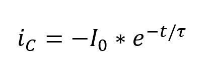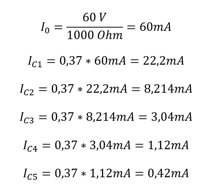 Nun kann man selbstverständlich auch den Strom berechnen, der während des Verstreichens der einzelnen Zeitkonstanten noch zur Verfügung steht. Dies ist nützlich, um ganz gezielt die Kondensator- und Widerstandgröße zu bestimmen, um ein gewünschtes Abfallverhalten zu erreichen.