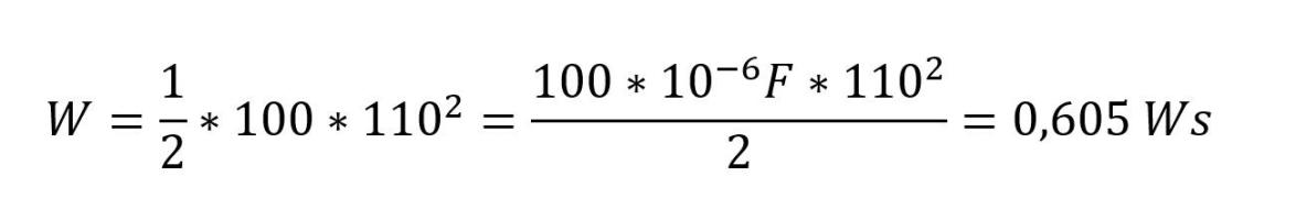 Angenommen, der Kondensator besitzt eine Kapazität von C=100 µF und wird mit U=110 V Gleichspannung geladen, dann ergibt sich: