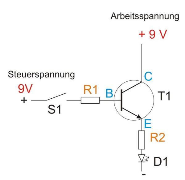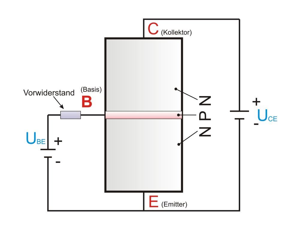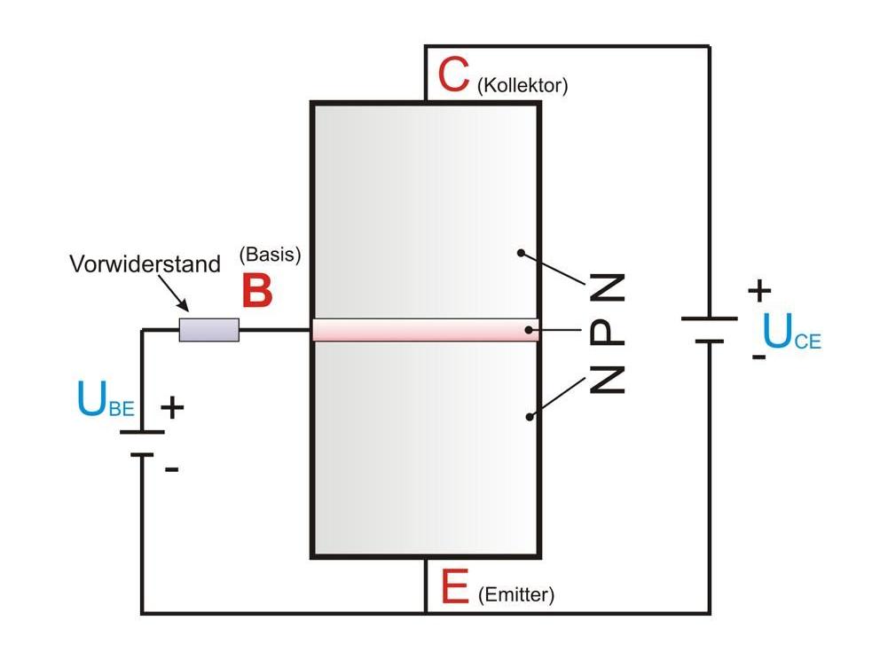 Ein Transistor lässt zwischen Kollektor und Emitter einen Strom fließen, wenn an der Basis eine Spannung von 0,4 bis 0,7 Volt anliegt. Damit ein Transistor zuverlässig schaltet, sollte der Basiswiderstand R1 so dimensioniert werden, dass die zwischen Basis und Emitter aufgebrachte Spannung deutlich über 0,5 Volt liegt, damit der Transistor voll durchschalten kann. Der Vorwiderstand muss jedoch mindestens so groß dimensioniert werden, dass die maximal zulässige Spannung an der Basis (in der Regel 5V) nicht überschritten wird.