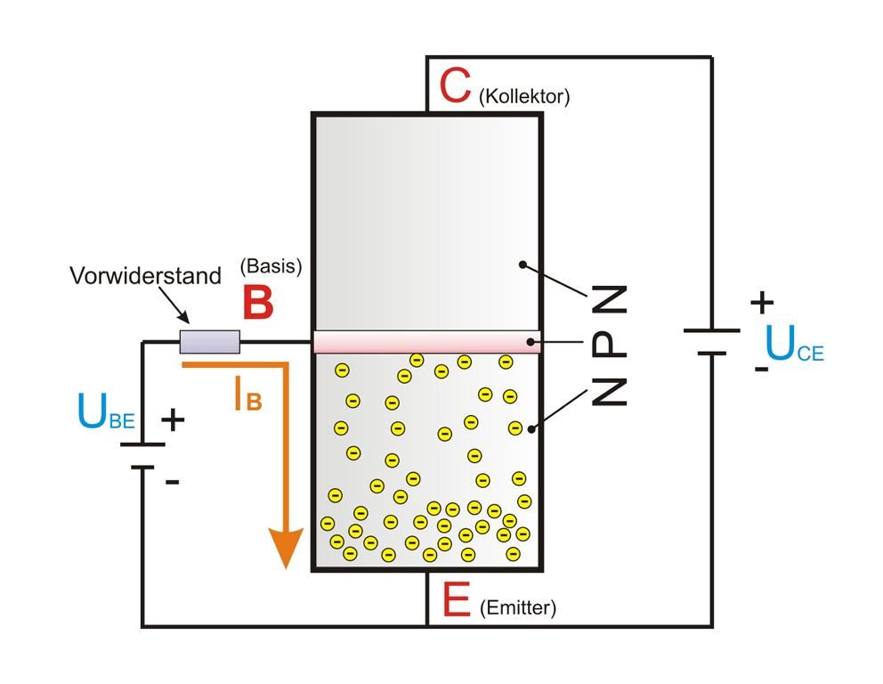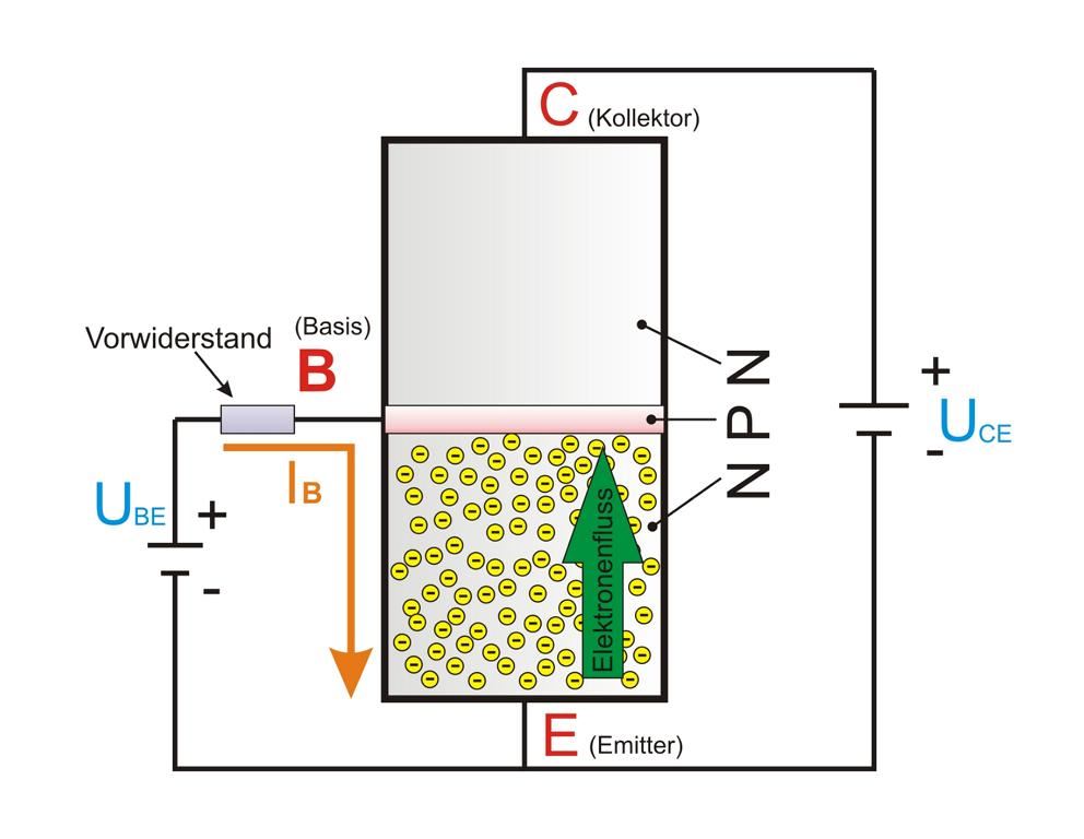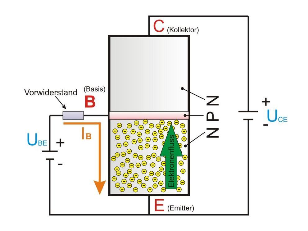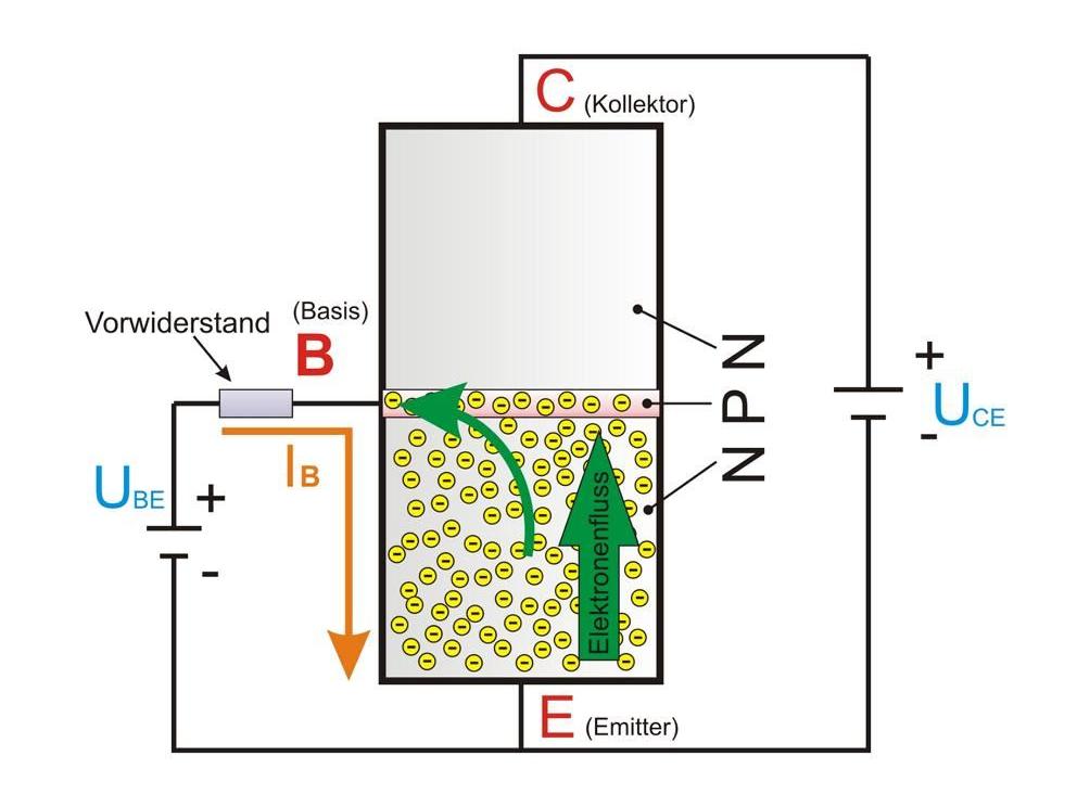 Die Basisspannung von 0,7 Volt bewirkt, dass Elektronen von der N-Schicht des Emitters zur P-Schicht der Basis wandern. Sie werden vom Plus-Pol der Spannung UBE angezogen. Dadurch, dass die P-Schicht nur sehr dünn ist, wird lediglich ein kleiner Teil der wandernden Elektronen in der P-Schicht weitergeleitet. Der größere Teil bewegt sich weiter in Richtung obere Grenzschicht, wodurch diese leitend wird. In der Folge zieht der Plus-Pol der Spannung UCE die Masse der Elektronen an und es fließt der Kollektorstrom IC. Etwa 99 Prozent der vom Emitter kommenden Elektronen wandern auf diese Weise zum Kollektor. In der dünnen Basisschicht fließt der Rest ab.