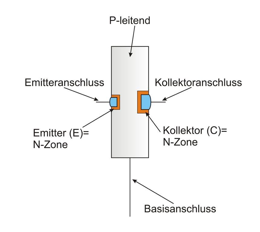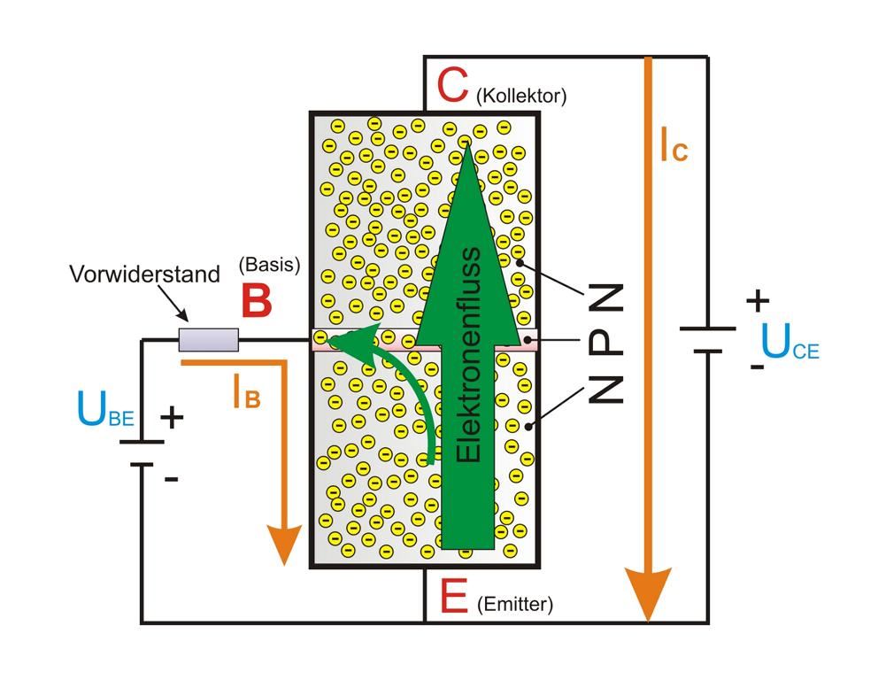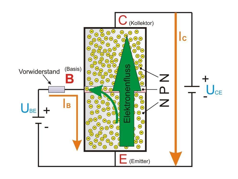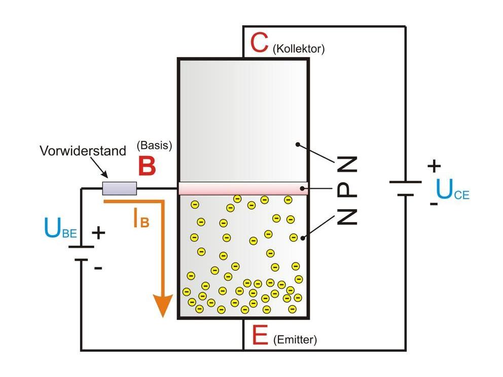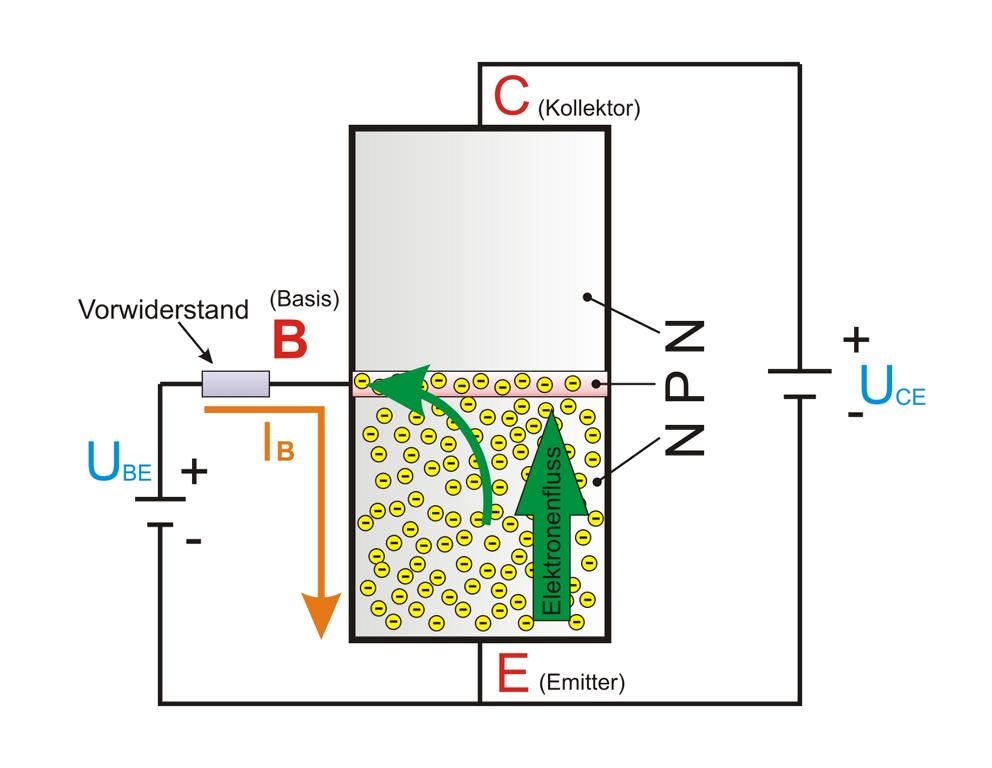 Die Basisspannung von 0,7 Volt bewirkt, dass Elektronen von der N-Schicht des Emitters zur P-Schicht der Basis wandern. Sie werden vom Plus-Pol der Spannung UBE angezogen. Dadurch, dass die P-Schicht nur sehr dünn ist, wird lediglich ein kleiner Teil der wandernden Elektronen in der P-Schicht weitergeleitet. Der größere Teil bewegt sich weiter in Richtung obere Grenzschicht, wodurch diese leitend wird. In der Folge zieht der Plus-Pol der Spannung UCE die Masse der Elektronen an und es fließt der Kollektorstrom IC. Etwa 99 Prozent der vom Emitter kommenden Elektronen wandern auf diese Weise zum Kollektor. In der dünnen Basisschicht fließt der Rest ab.