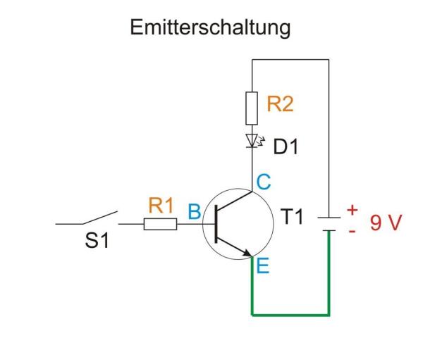 Die Emitterschaltung erkennt man daran, dass der Emitteranschluss des Transistors direkt mit der Spannungsversorgung verbunden ist. Es sind keine Verbraucher zwischengeschaltet. Diese Schaltung eignet sich optimal zum Verstärken von Spannungen. Der Vorwiderstand am Basisanschluss muss so bemessen werden, dass der gewünschte Laststrom sicher erreicht, der Basisstrom jedoch nicht unnötig groß wird.