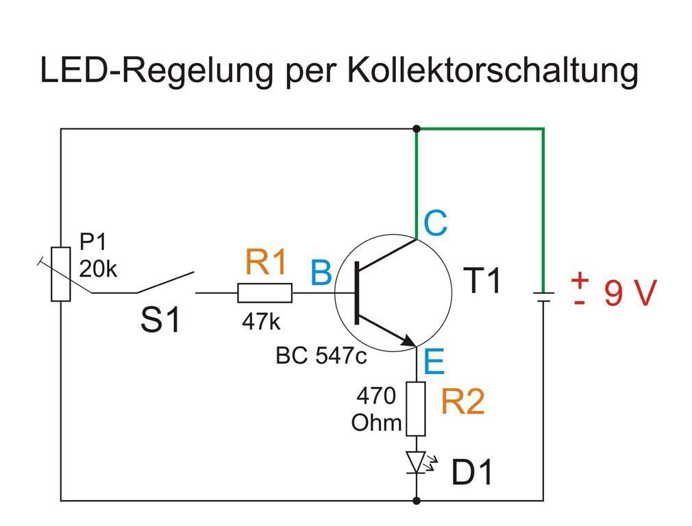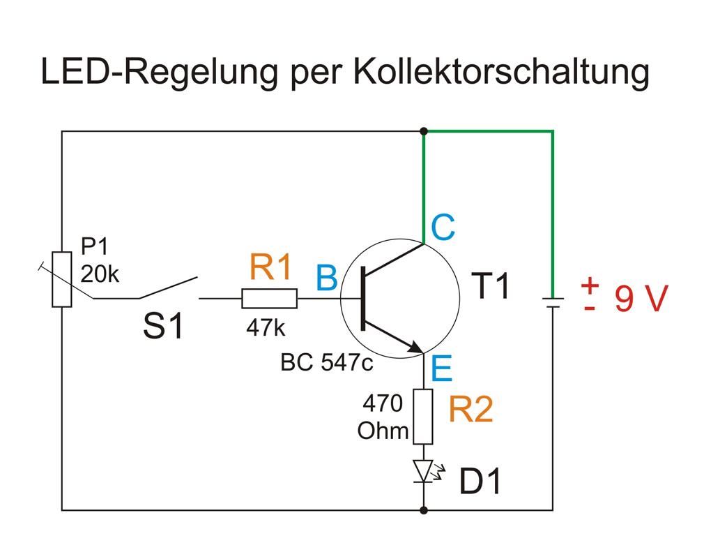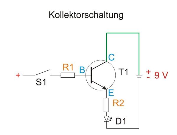 Die Kollektorschaltung wird daran erkannt, dass der Kollektoranschluss des Transistors direkt mit der Spannungsversorgung verbunden ist. Mit dieser Schaltung werden kleine Steuerströme vom Basisanschluss in größere umgesetzt. Daher eignet sie sich auch nicht zur Spannungsverstärkung, da die am Emitter erzielbare Spannung nie größer werden kann, als diejenige Spannung, die an der Basis anliegt. Dieses Verhalten ist optimal, um den Transistor für Regelungsaufgaben einzusetzen. Für Kleintransitoren liegt die zulässige Spannung (VEBO) zwischen fünf und sechs Volt. Ist die Steuerspannung größer, muss ein Vorwiderstand den Strom an der Basis auf das zulässige Maß reduzieren, ansonsten kann auf diesen verzichtet werden.