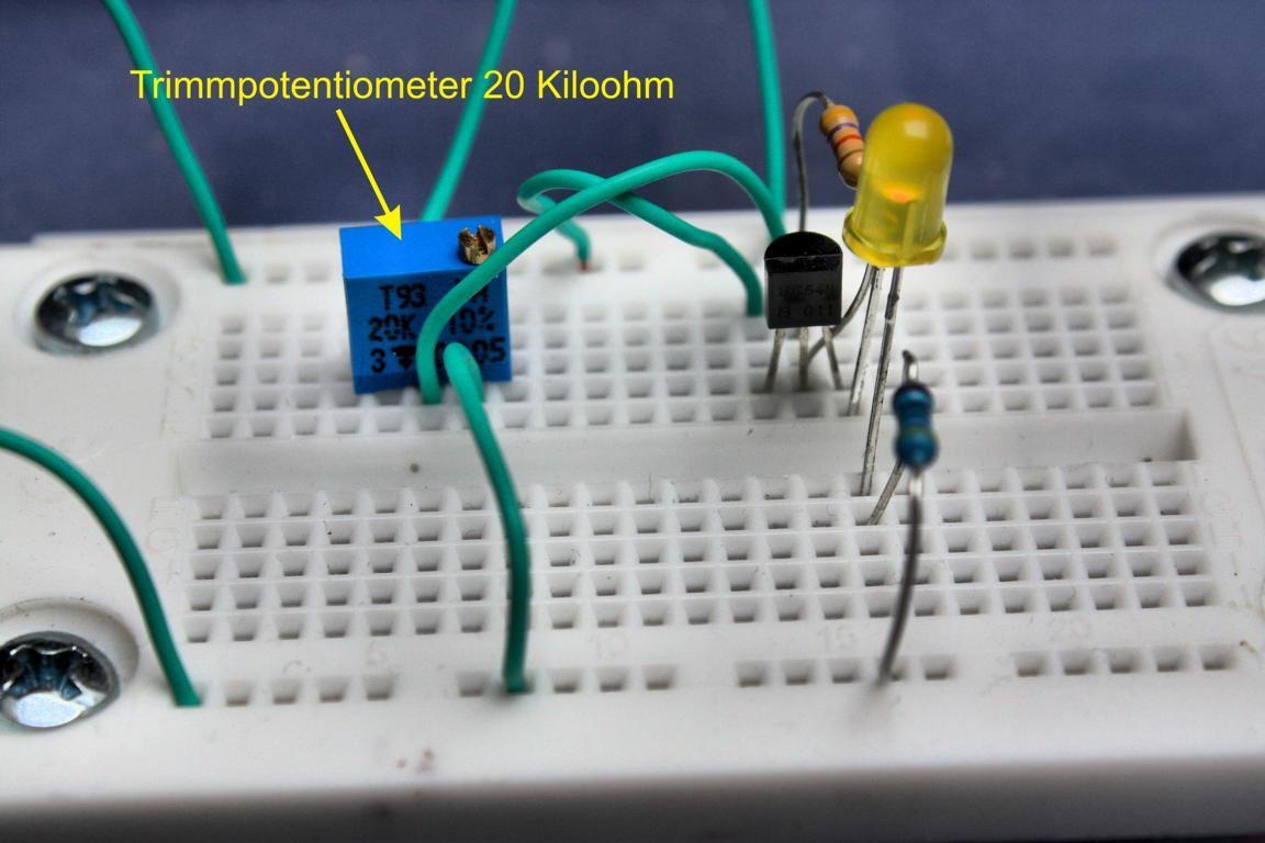 Die Spannung am Basisanschluss des Transistors müsste bei Verwendung eines Vorwiderstands von 47 kOhm rechnerisch 1,48 V betragen. Sie liegt damit weit unter der zulässigen Basisspannung, die bei einem BC 547C maximal 5 V beträgt. In der Praxis wird sich wegen der physikalischen Gegebenheiten beim Durchschalten des Transitors an der Basis jedoch stets eine Spannung von 0,7 V einstellen, wie Messungen zeigen.