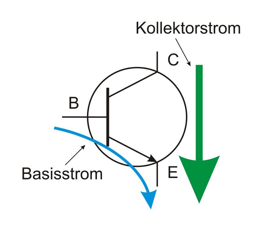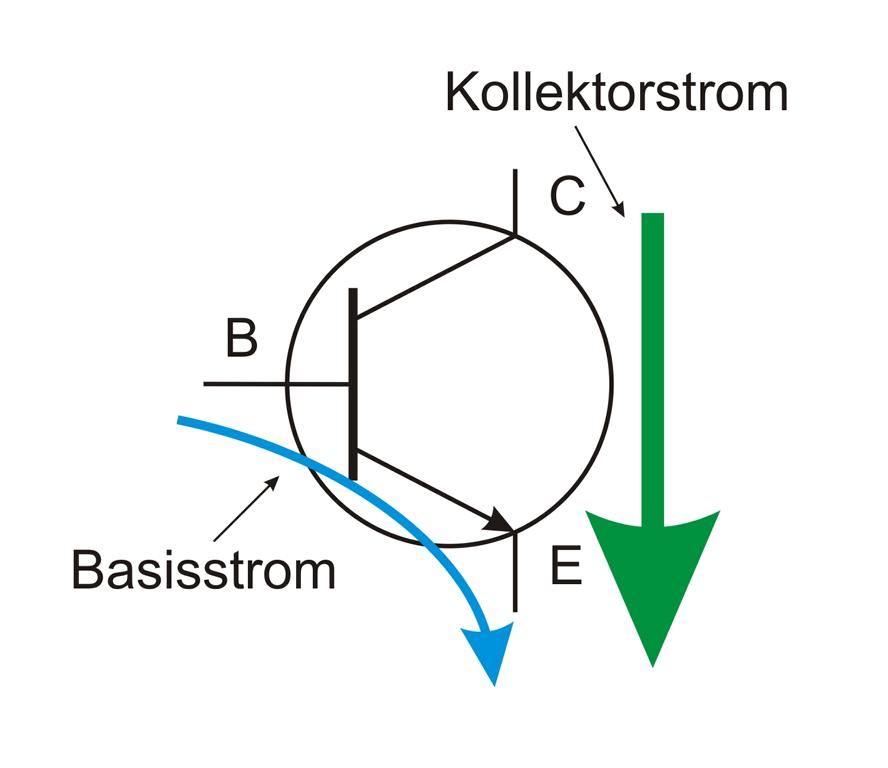 Dieser Basisstrom ist für einen Kollektorstrom verantwortlich, der weit größer als der auslösende Basisstrom ist, was im Verstärkungsfaktor des Transistors zum Ausdruck kommt.