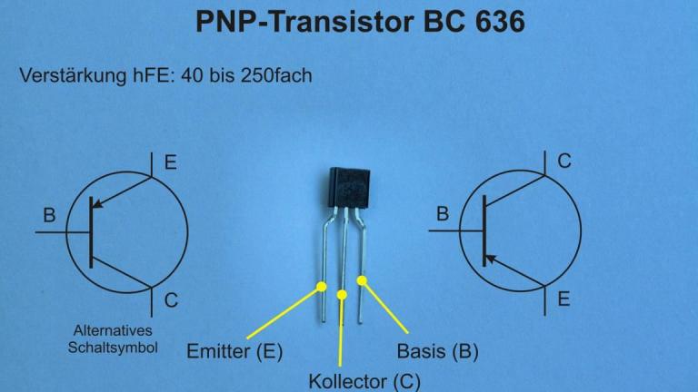 Beim Transistor ist es wichtig zu wissen, wo welche Anschlüsse zu finden sind und wie diese korrekt bezeichnet werden: Als Basis (B) wird derjenige Anschluss bezeichnet, der als Steuereingang fungiert. Er befindet sich in aller Regel in der Mitte des Transistors. Sobald an der Basis eine Spannung anliegt, die über der Schaltschwelle des jeweiligen Transistors liegt, schaltet der Transistor die Verbindung Kollektor (C)-Emitter (E) durch. Auf dieser Strecke fließt dann ein wesentlich größerer Strom, als derjenige, der zum Schalten des Transistors benötigt wurde. Diese Tatsache kommt im Verstärkungsfaktor des Transistors zum Ausdruck.