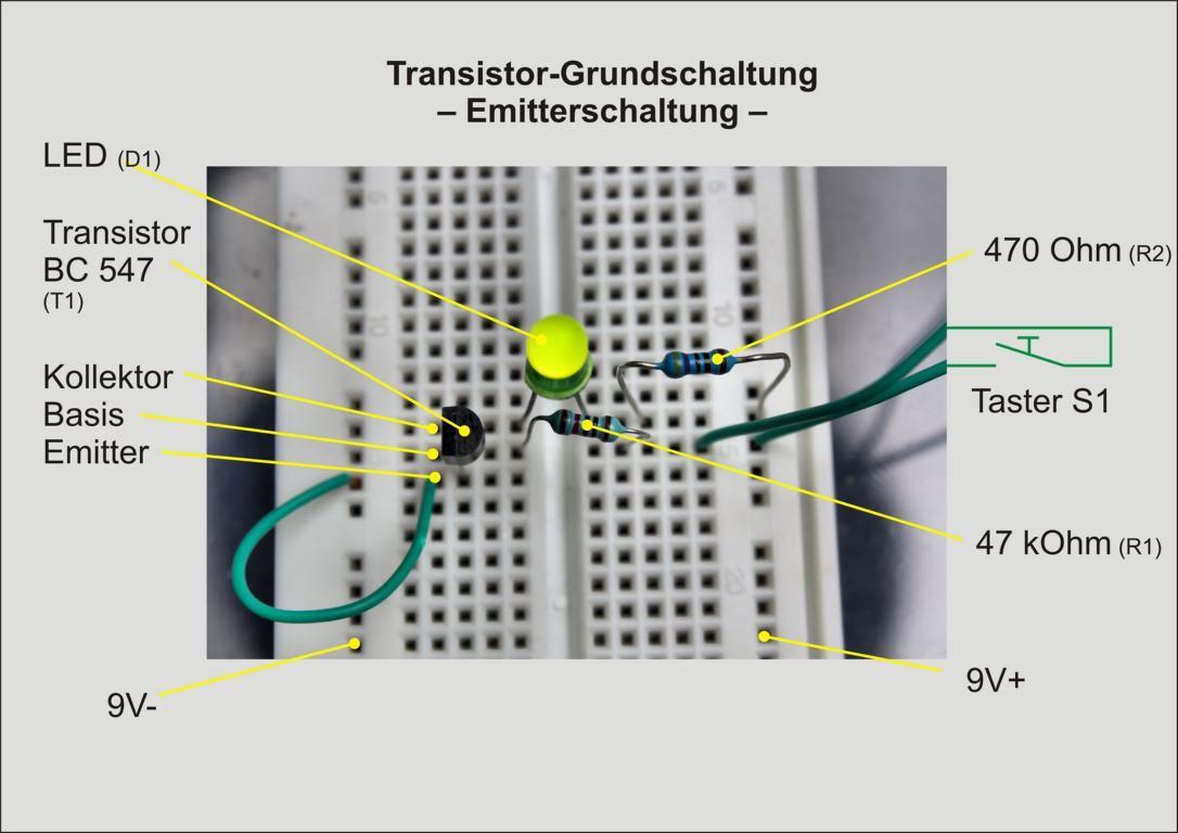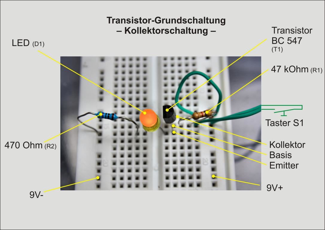 Transistoren können auf dreierlei Art verwendet werden: als Schalter, als Verstärker und als Regler. Obwohl die Handhabung von Transistoren unkritisch ist, muss zunächst ein wenig Theorie beachtet werden, damit dieser nicht durch zu hohe Spannungen zerstört wird oder Anschlüsse versehentlich vertauscht werden, wodurch dessen korrekte Funktion unterbleibt.