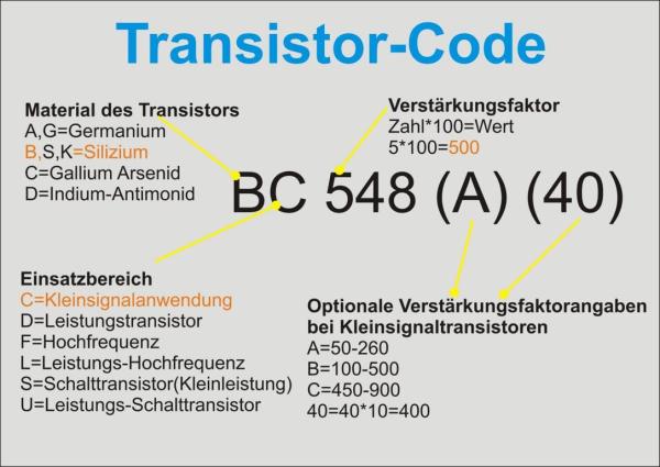 Die Bezeichnung eines Transistors gibt bereits eine ganze Menge Auskunft über dessen Eigenschaften. Seine Wichtigste ist der Verstärkungsfaktor hFE, der es erlaubt, ein schwaches, an der Basis anliegendes Signal kräftig zu Puschen. Damit können dann Verbraucher, wie etwa LED-Lampen betrieben werden.