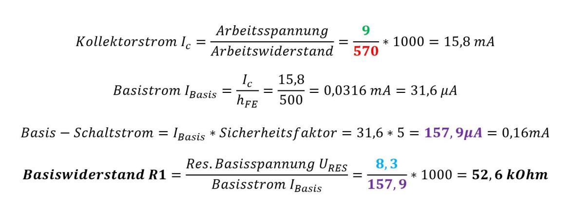 Das Berechnen des passenden Basiswiderstands ist ein mehrstufiger Prozess. Zunächst ist der Strom zu ermitteln, der durch den Verbraucher fließt. Das Ergebnis bestimmt, welcher Transistor genutzt werden muss, damit nicht die Gefahr besteht, dass ein unzulässig hoher Strom einen dafür nicht ausgelegten Transistor zerstört. Das Ergebnis dieser Berechnung ist der später durch den Kollektor fließende Kollektorstrom Ic. Im vorliegenden Beispiel bildet eine LED zusammen mit einem Vorwiderstand den Verbraucher. Bei zwei Volt Spannung und einem Stromfluss von 20 mA kann nach dem Ohmschen Gesetz ein Widerstand von 100 Ohm für die LED berechnet werden. Zusammen mit dem Vorwiderstand von 470 Ohm ist somit ein Arbeitswiderstand von 570 Ohm bei der Berechnung des Basiswiderstands für den Transistor zu berücksichtigen.