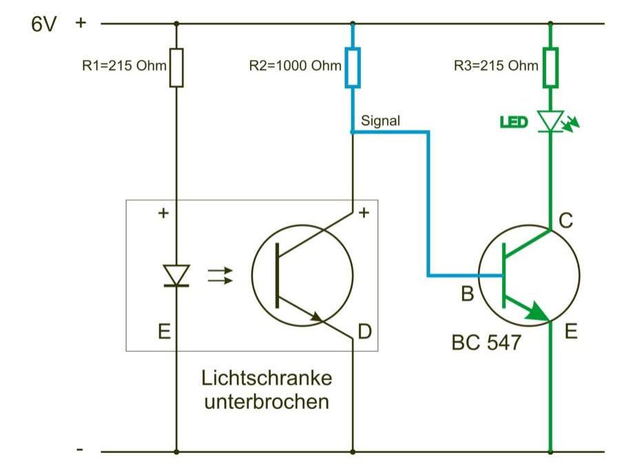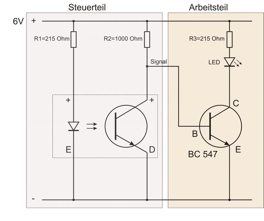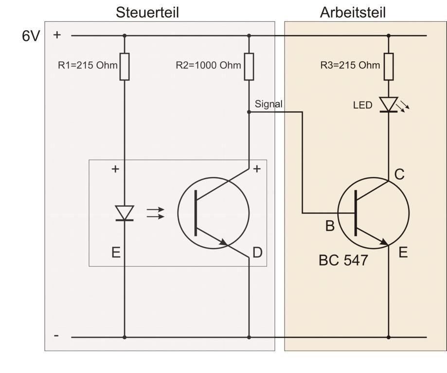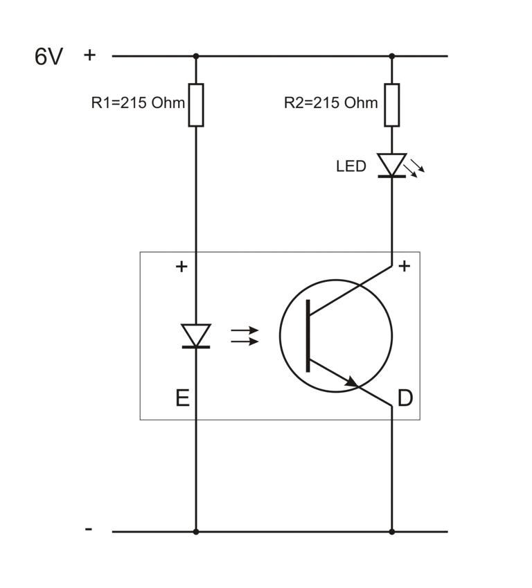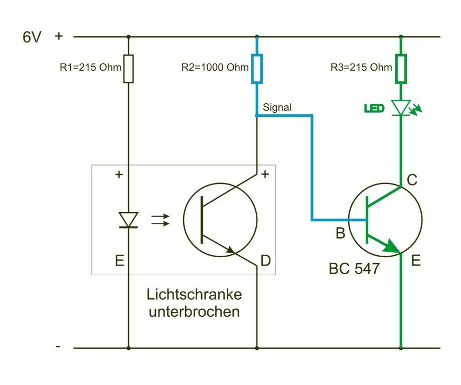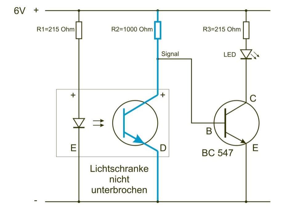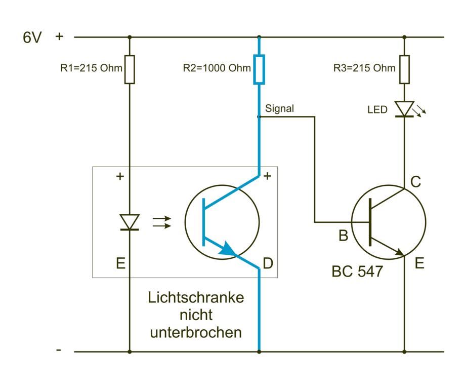 Wird die Schaltung mit einer Spannung von 6 Volt betrieben, so ist ein Vorwiderstand von circa 215 Ohm zu verwenden. Da eine zweite LED die Funktion der Lichtschranke kenntlich machen soll, ist hier ein weiterer Widerstand von ebenfalls 215 Ohm zu berücksichtigen.
