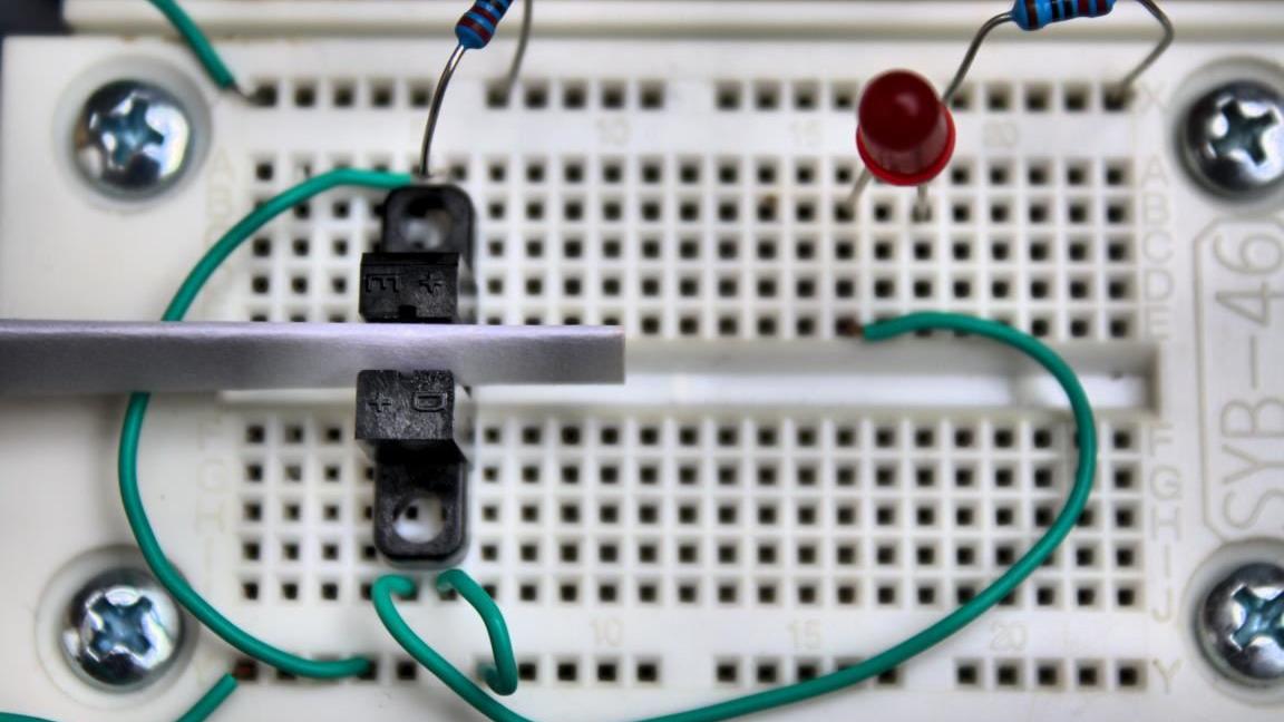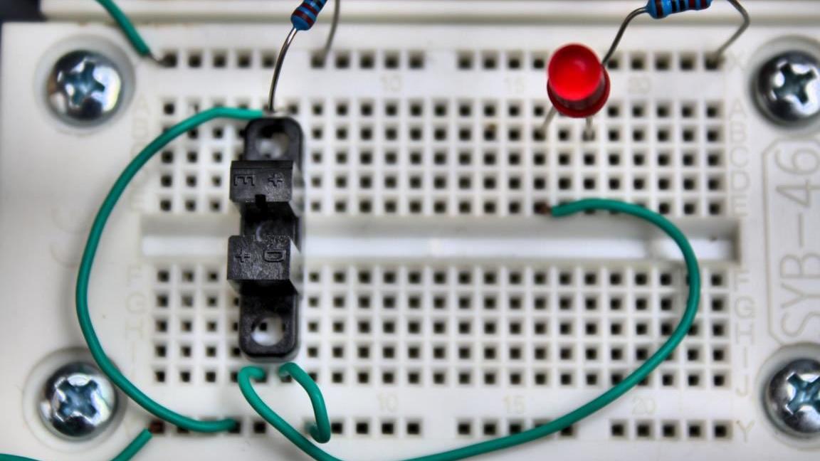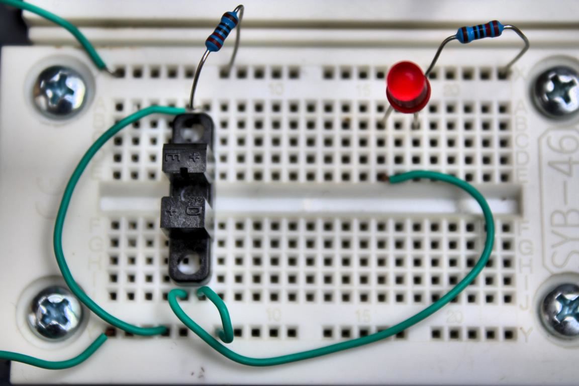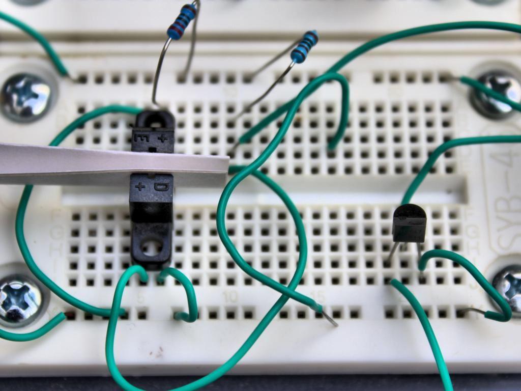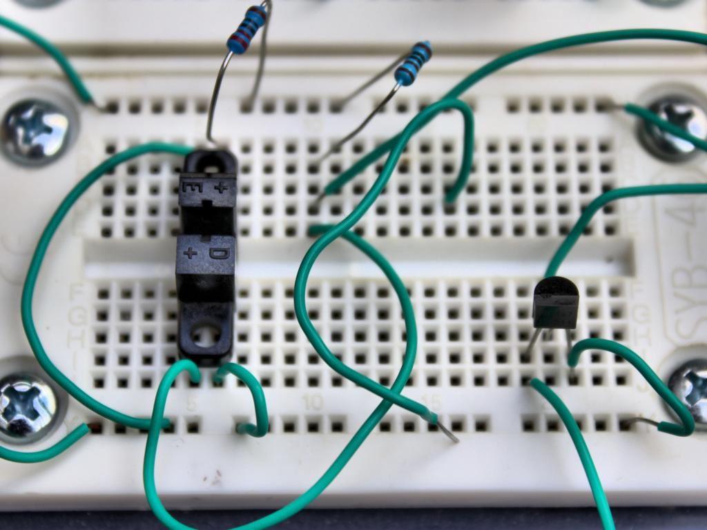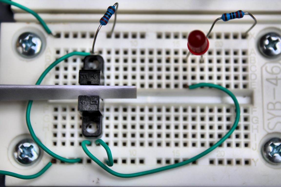 Wie sich zeigt, leuchtet die auf dem Steckbrett befestigte LED, nachdem die Stromversorgung aktiviert wurde. Dies ist korrekt, da die in der Gabellichtschranke eingebaute LED ebenfalls leuchtet, sobald die Stromversorgung aktiv ist. Der dadurch ausgelöste Lichteinfall führt dazu, dass der Fototransistor durchschaltet. Wird der Lichtstrahl von der in der Gabellichtschranke eingebauten LED unterbrochen, so kommt auch der Stromfluss des Fototransistors zum Erliegen.