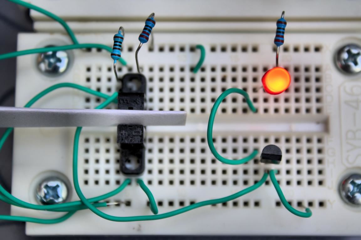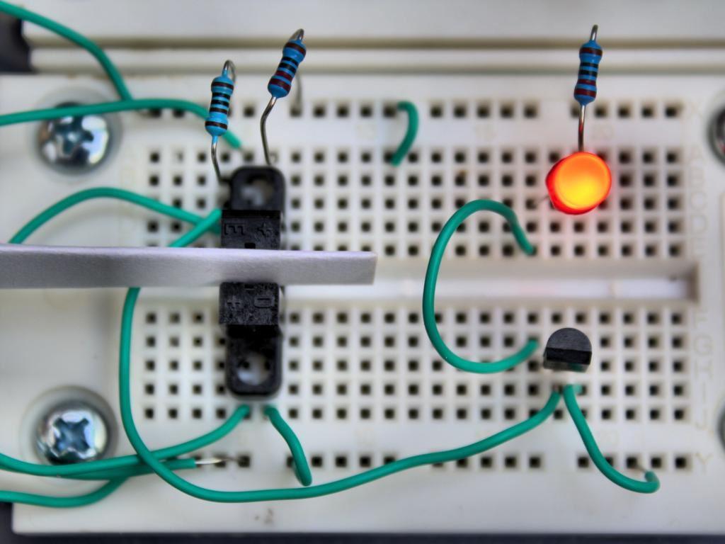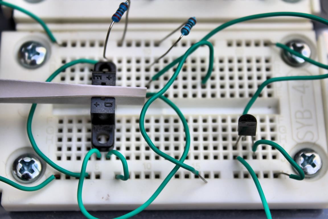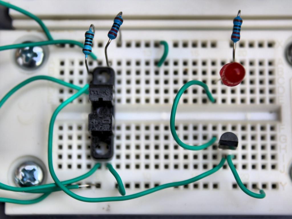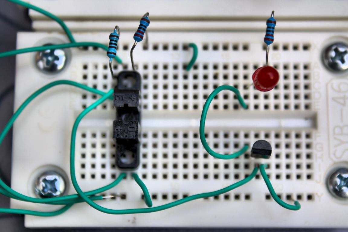 Wie sich zeigt, leuchtet die auf dem Steckbrett befestigte LED, nachdem die Stromversorgung aktiviert wurde. Dies ist korrekt, da die in der Gabellichtschranke eingebaute LED ebenfalls leuchtet, sobald die Stromversorgung aktiv ist. Der dadurch ausgelöste Lichteinfall führt dazu, dass der Fototransistor durchschaltet. Wird der Lichtstrahl von der in der Gabellichtschranke eingebauten LED unterbrochen, so kommt auch der Stromfluss des Fototransistors zum Erliegen.