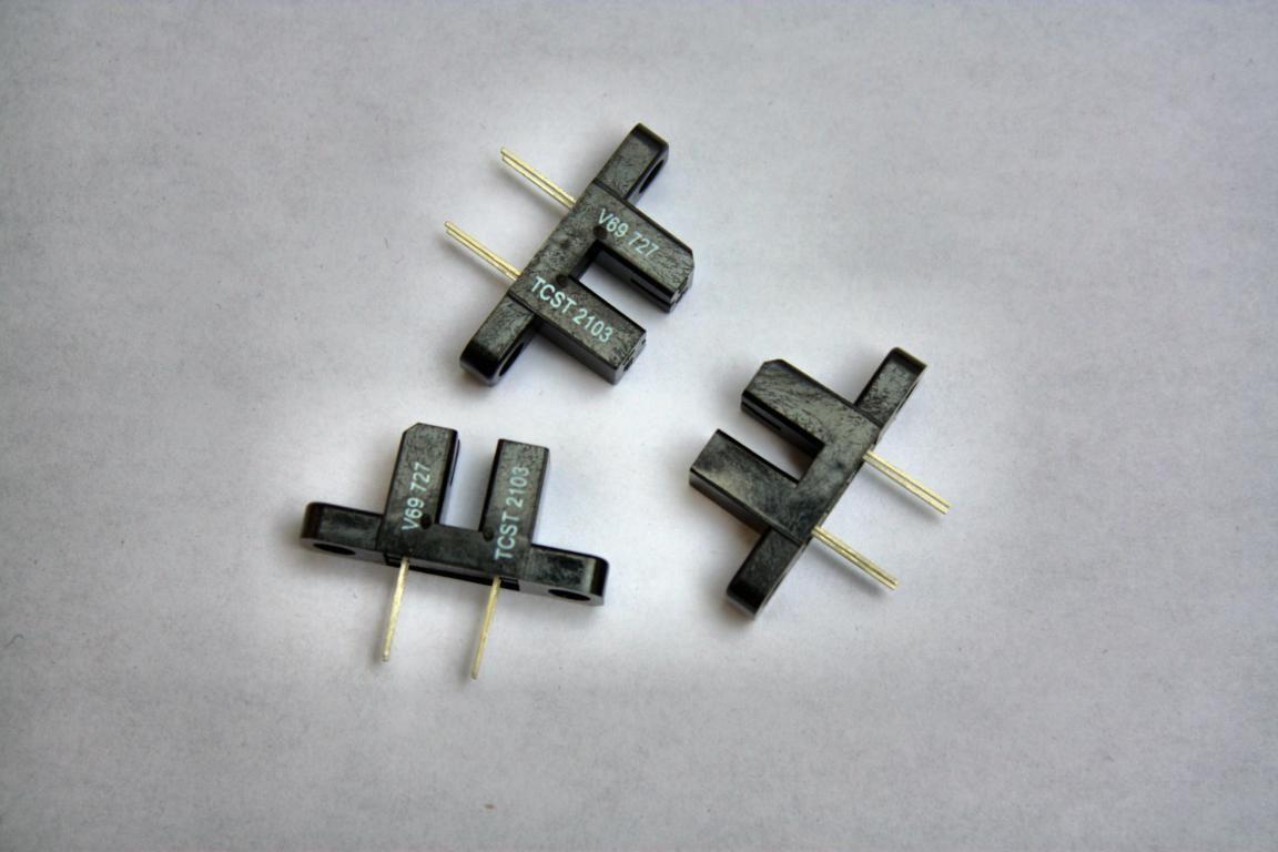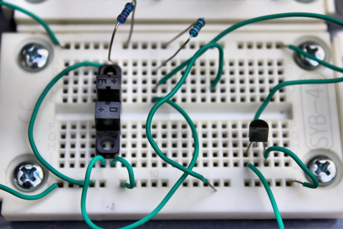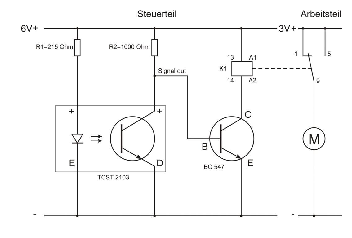 In diesem Beispiel wird eine Lichtschranke vom Typ ›TCST 2103‹ verwendet. In dieser Lichtschranke ist ein NPN-Fototransistor verarbeitet. Für andere Lichtschrankentypen muss eventuell das dazugehörige Datenblatt studiert werden, um auszuschließen, dass dort ein PNP-Fototransistor verbaut ist. In diesem Fall sind die Anschlüsse zu vertauschen, wenn die Schaltung nicht wie erwartet funktioniert.
