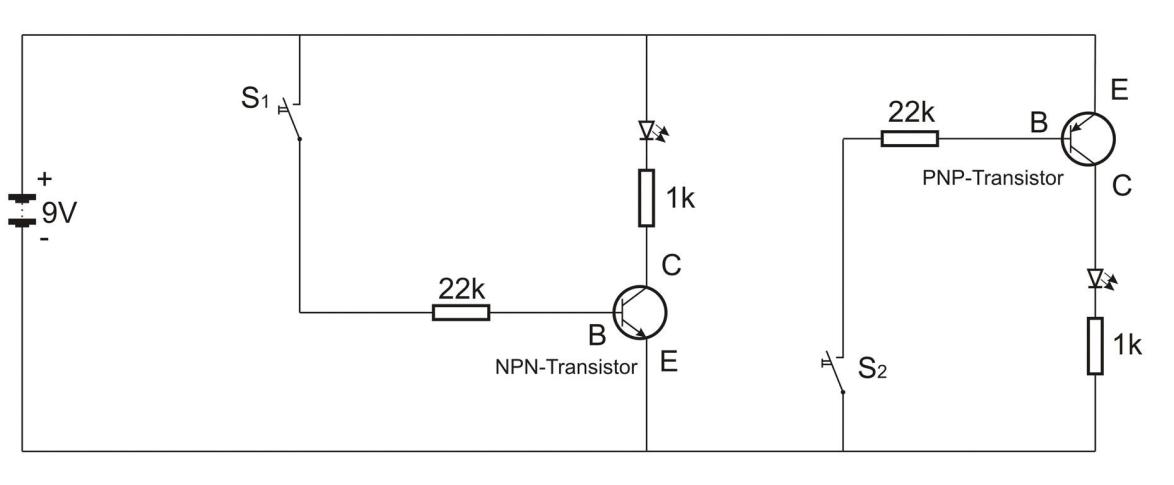 Für die Basisvarianten von NPN- und PNP-Transistoren wären nun die Schaltungen vorhanden, um ein entsprechendes Prüfgerät aufzubauen. Da liegt es nahe, diese Schaltungen zu einer einzigen Schaltung zu vereinen.
