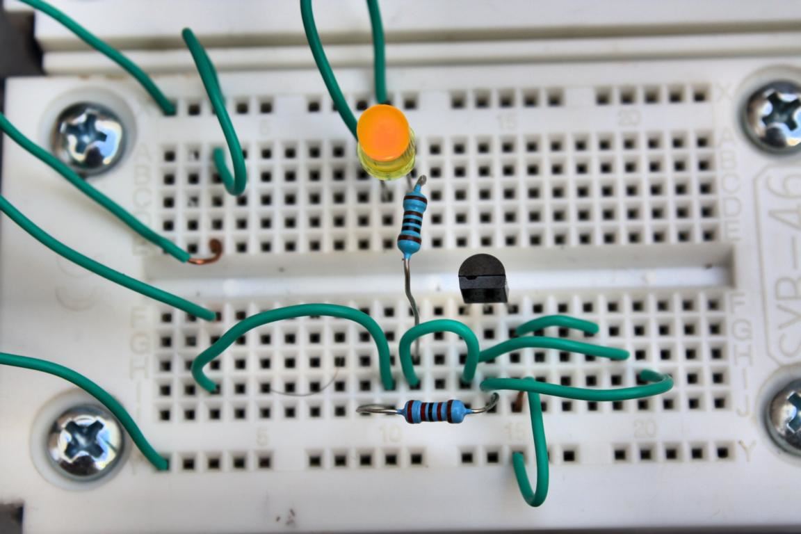 Der reale Aufbau auf einem Steckbrett sollte bei einer Musterschaltung stets der erste Schritt sein. Dadurch können nicht nur Fehler im Schaltungsaufbau erkannt werden, sondern sind auch gleich defekte Bauteile aufspürbar, was im eingelöteten Zustand nur mehr schwer möglich ist.