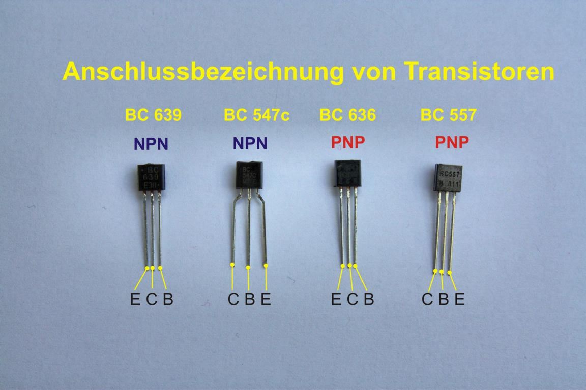 Wie bereits angedeutet, gibt es für die Transistor-Gruppen NPN und PNP eine Besonderheit: Mancher Hersteller hat für seine Transistoren eine vom Standard abweichende Anschlussbezeichnung gewählt. Bei diesen Transistoren sitzt, vom flachen Gehäuseteil aus betrachtet, der Basisanschluss rechts außen, während der Kollektor in der Mitte zu finden ist. Im obigen Bild ist dies am Transistor BC 636 zu erkennen.