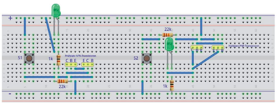 Um nun ohne großen Umstand diese Transistorvarianten testen zu können, genügt es, am späteren Prüfgerät eine eigene Steckmöglichkeit für den zu prüfenden Transistor zu berücksichtigen. Zu beachten ist lediglich, von dort aus die Anschlüsse für Basis, Emitter und Kollektor passend der Schaltung zuzuführen.